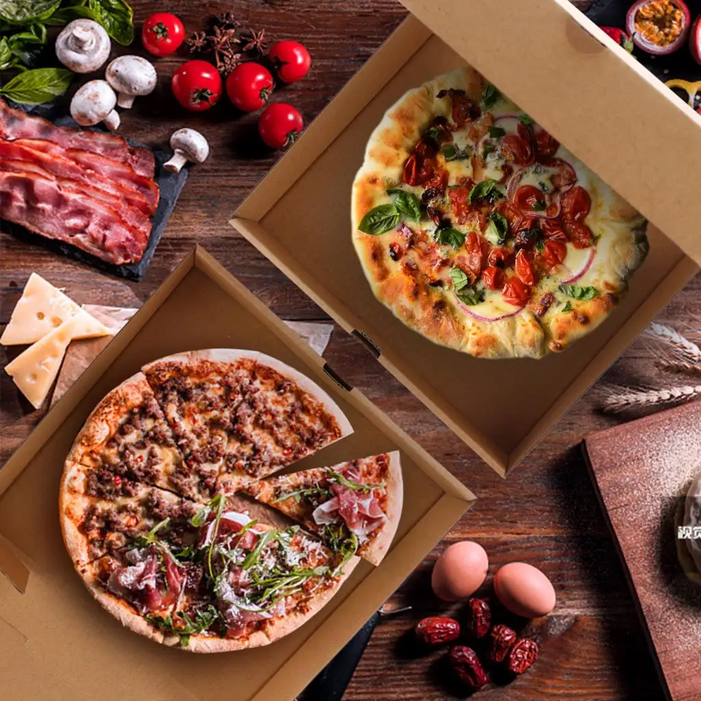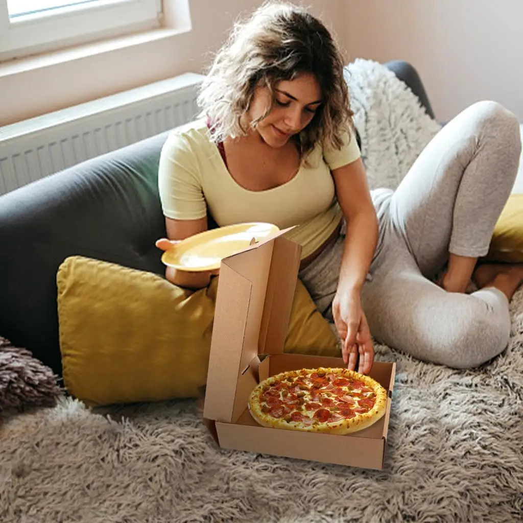 🍕Добавить личный сенсорный-чистый крафт коричневый цвет отделка внутри и снаружи, чтобы дать профессиональный и изысканный вид, вы можете рисовать, рисовать и DIY коробки для пиццы, как вы хотите, или добавьте логотип бренда или этикетки в коробку для пиццы для вашего бизнеса.