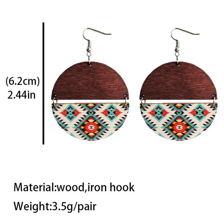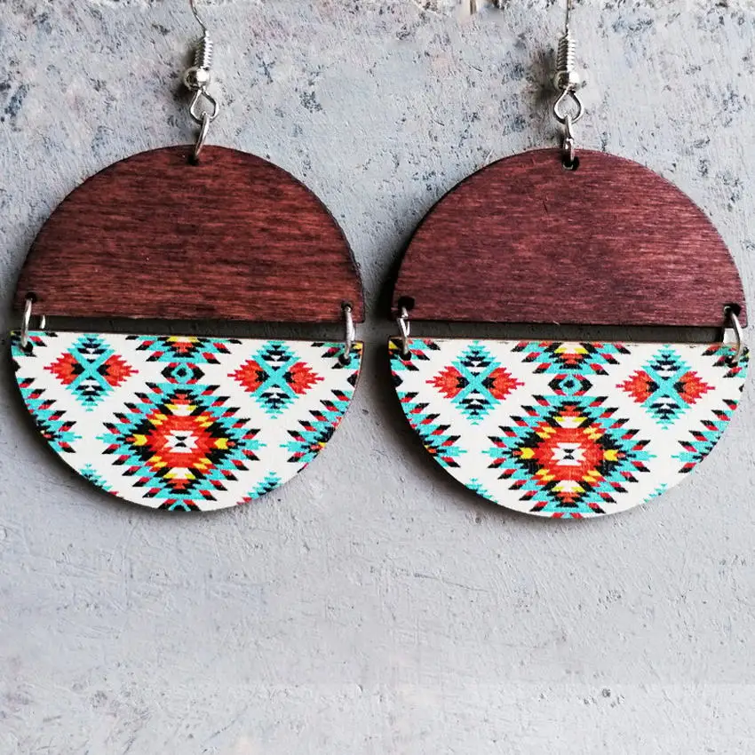 Ацтекский стиль шарнирные круглые деревянные серьги Западный геометрический Ловец снов в полоску с принтом двухцветных круглых серег ювелирные изделия