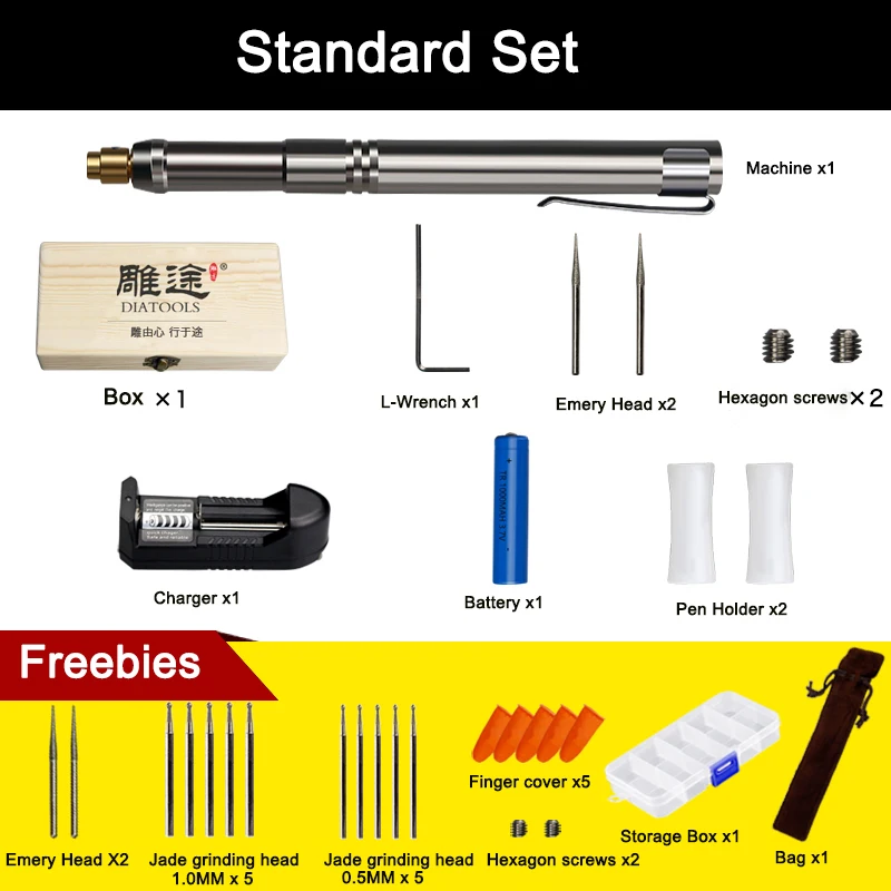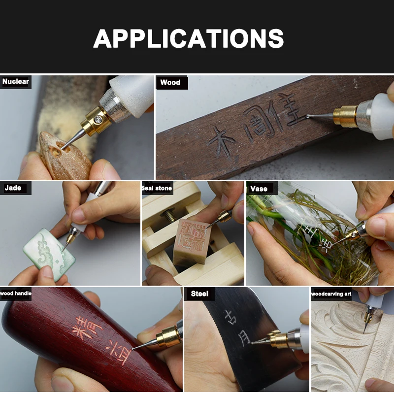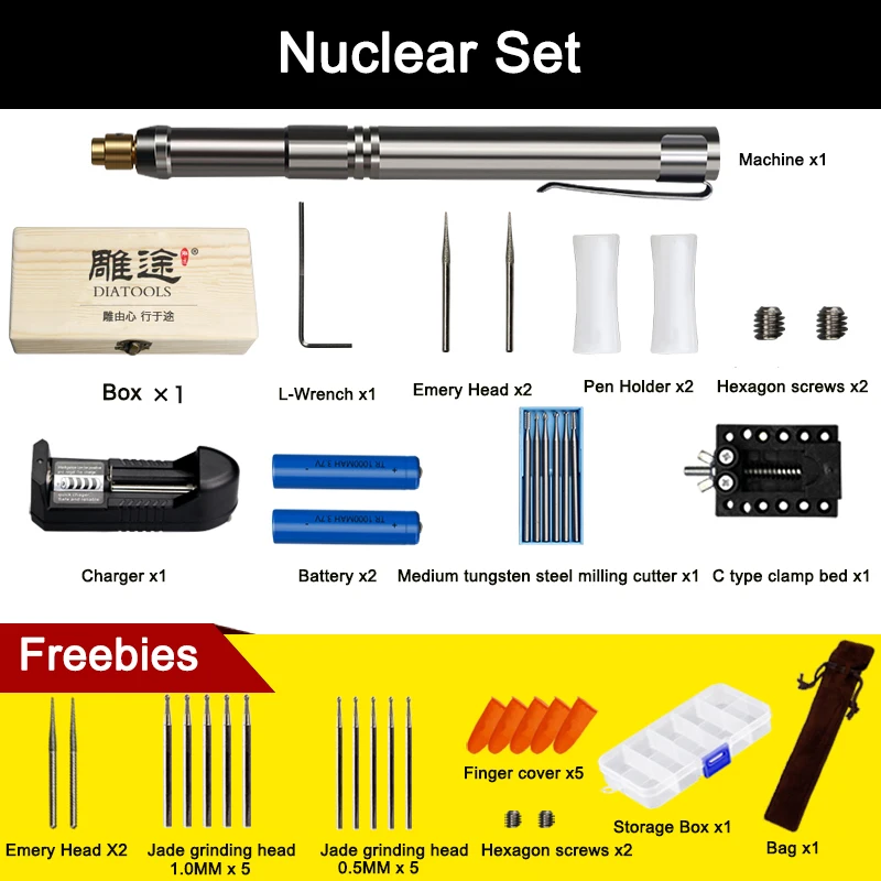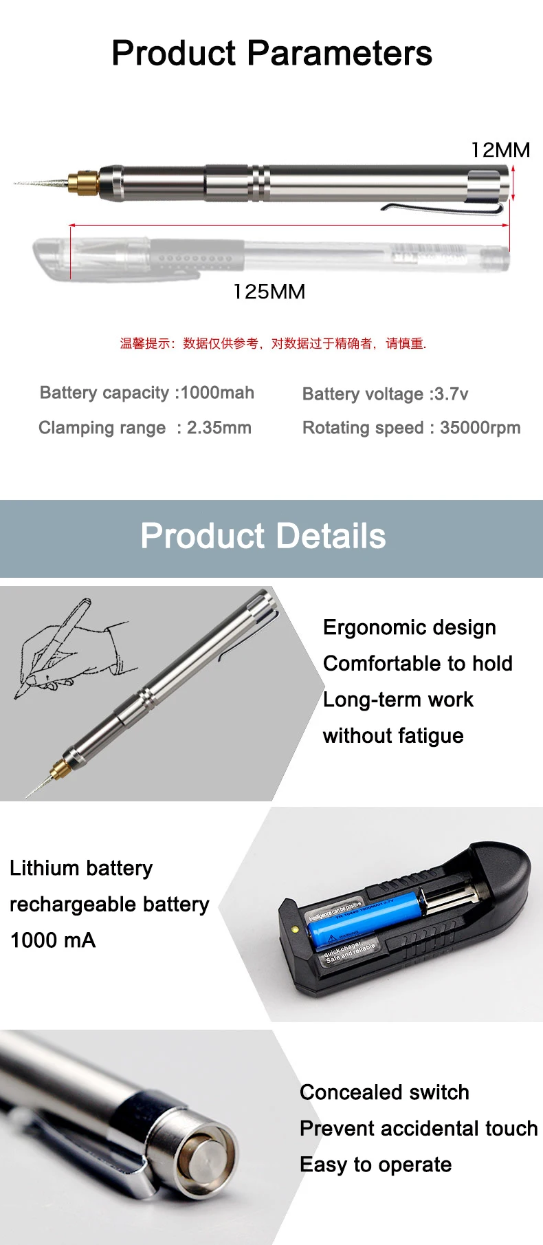 • Он имеет эргономичный дизайн и изготовлен из всех металлических материалов. Он красивый, практичный и многофункциональный. Это идеальный компаньон для друзей скульптуры, живописи и письма. Продукт принимает беспроводной дизайн литиевой батареи, куда бы вы ни отправились, портативный и практичный!