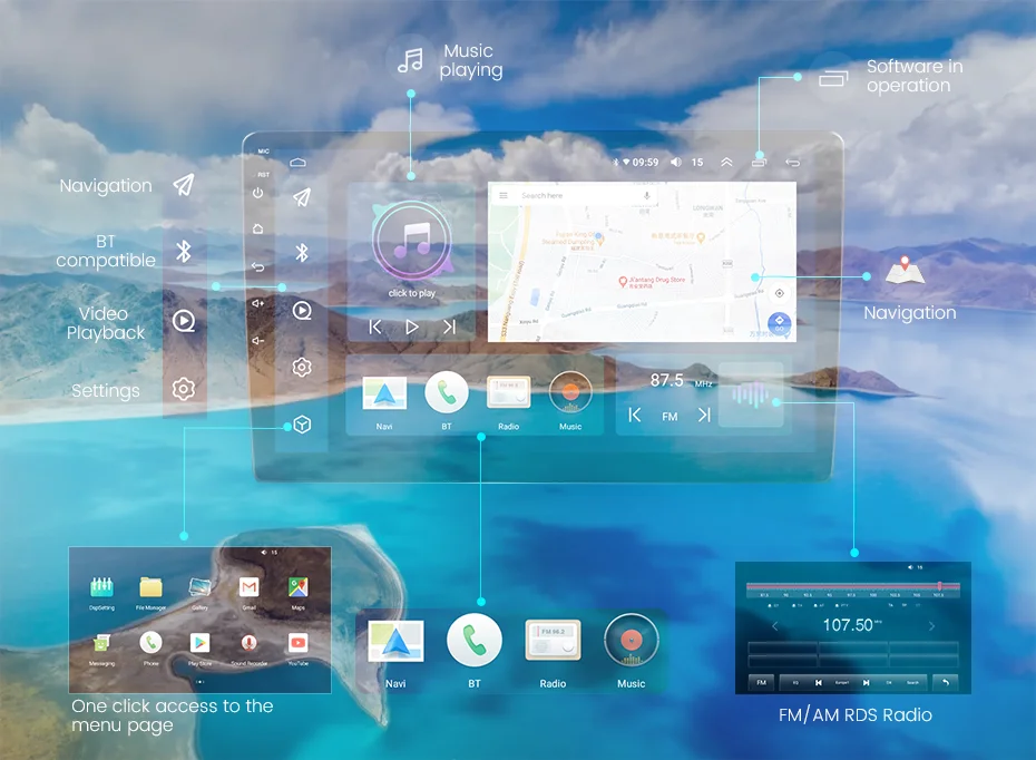 Поддержка онлайн-карты, таких как google map, sygic ,waze ,yandex, igo ,Navitel и т. Д. Встроенная Глобальная система позиционирования, всенаправленный отображение карты синхронный дисплей в режиме реального времени условия движения, быстрое и точное позиционирование