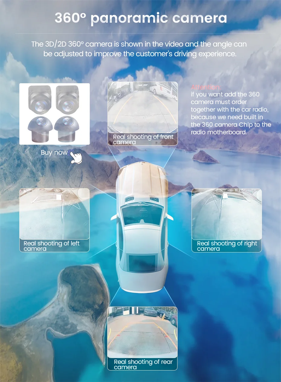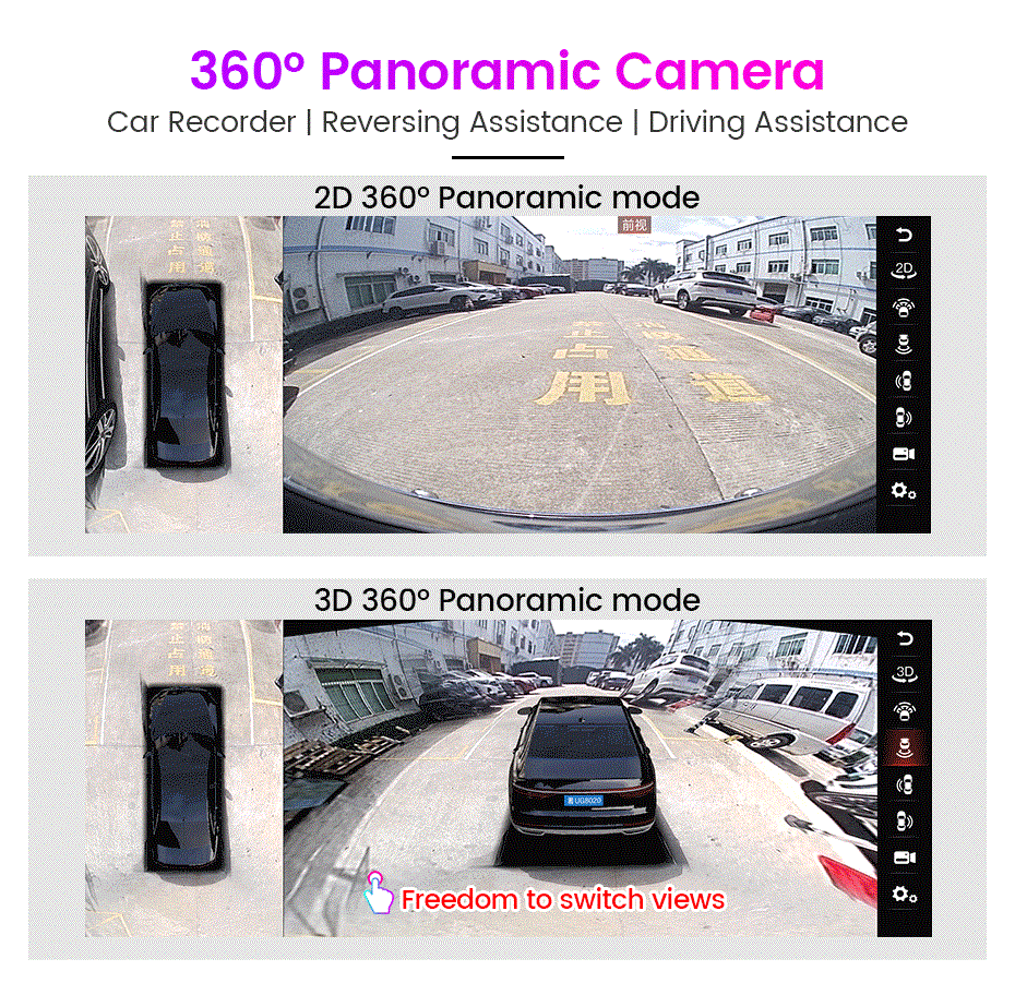 Панорамный режим 3D/2D 360 градусов облегчает вождение с помощью слепых зон. Визуализация более удобная и безопасная парковка и Реверсивный ход. Камера 3D/2D 360 ° показана на видео, и угол можно отрегулировать, чтобы улучшить опыт вождения клиента, Но аксессуары для камеры 360 в комплект не входят, вам нужно купить их отдельно, пожалуйста, нажмите на картинку ниже, чтобы купить аксессуары для камеры 360!