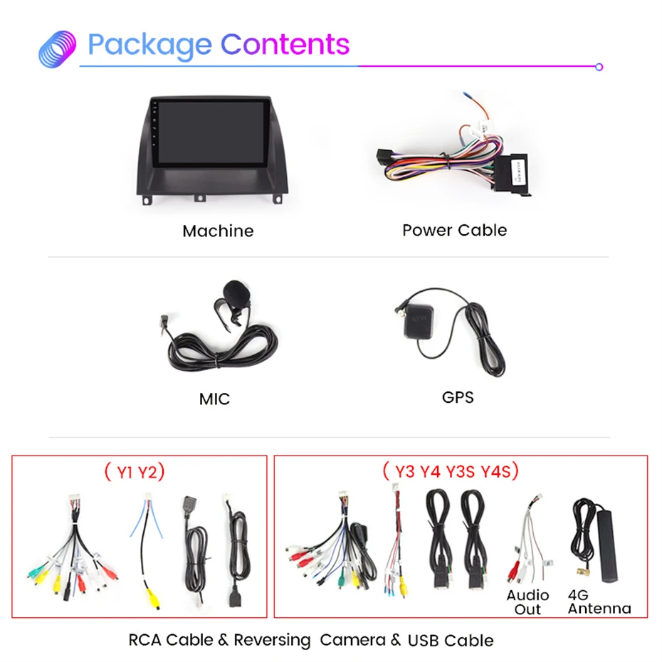 Рамки + одна навигационная машина + силовые кабели + один Реверсивный видео кабель камеры с WiFi и Bluetooth сигнальные кабели + три USB кабеля + один GPS антенный кабель + один RCA кабель с внешним входом микрофона с одним слот для sim-карты 4G (поддерживает только 4 + 64G и 8 + 128G) + антенный кабель 4G (поддерживает только 4 + 64G и 8 + 128G) + один инструмент для установки в подарок + один внешний микрофон в подарок