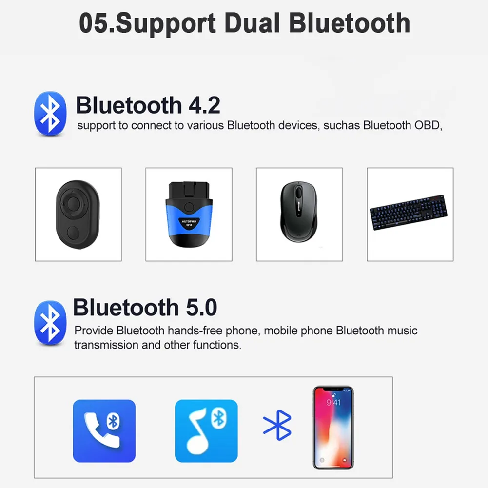 * Встроенный двойной Bluetooth для ручного вызова, музыки и подключения всех видов Bluetooth TPMS,OBDII и т. Д.