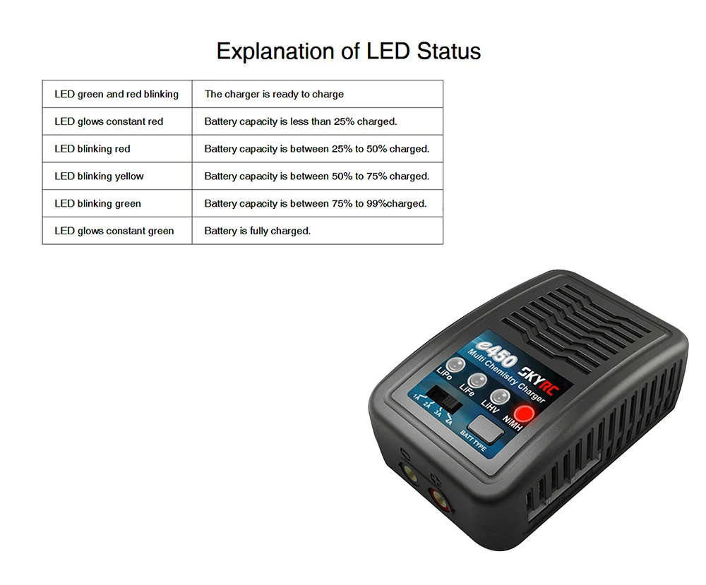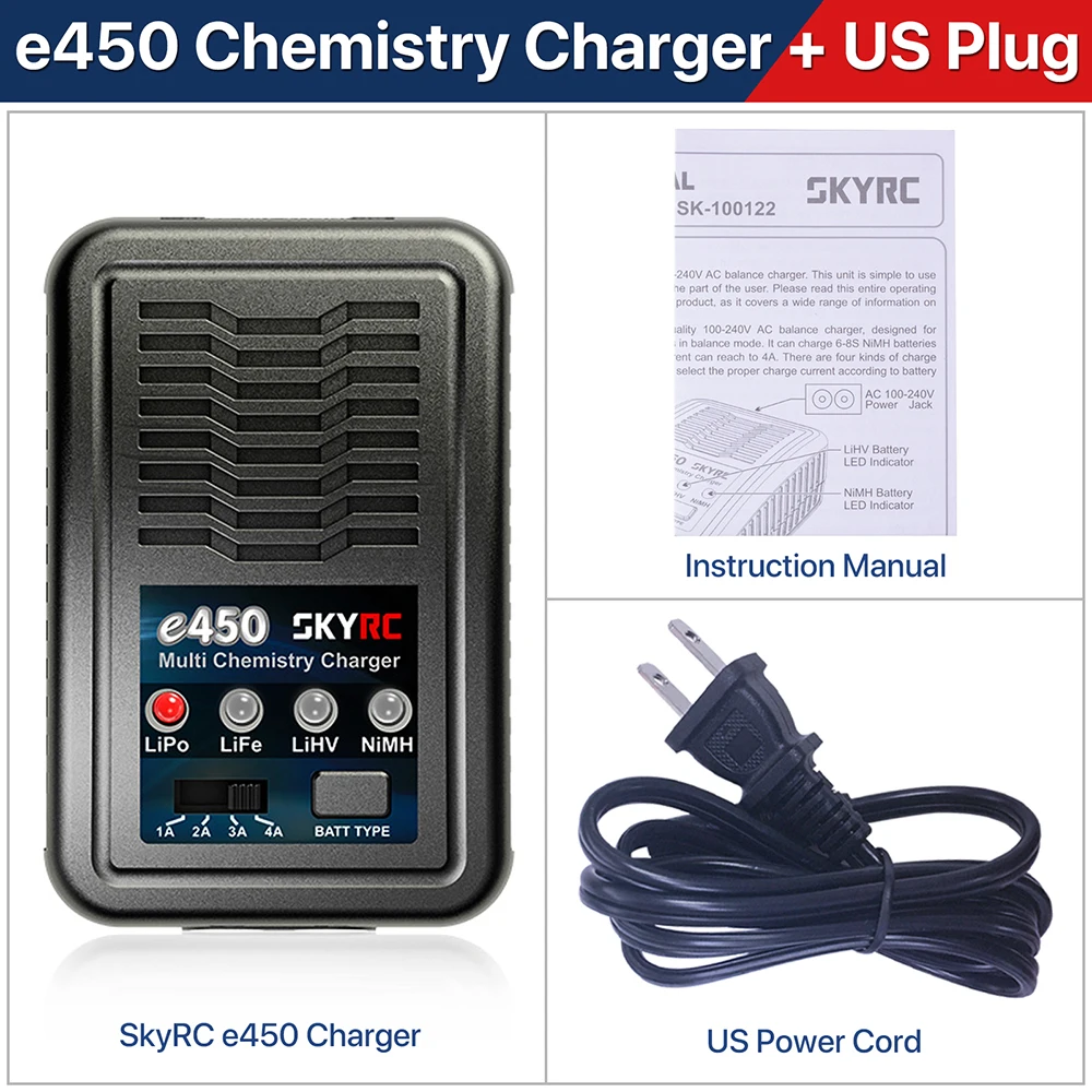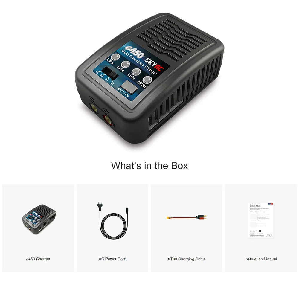 Оригинал от SKYRC! Зарядное устройство SkyRC e450-это экономичное, высококачественное зарядное устройство 100-240 В переменного тока, предназначенное для зарядки батарей LiPo, LiFe и LiHV от 2-4 ячеек в балансовом режиме.