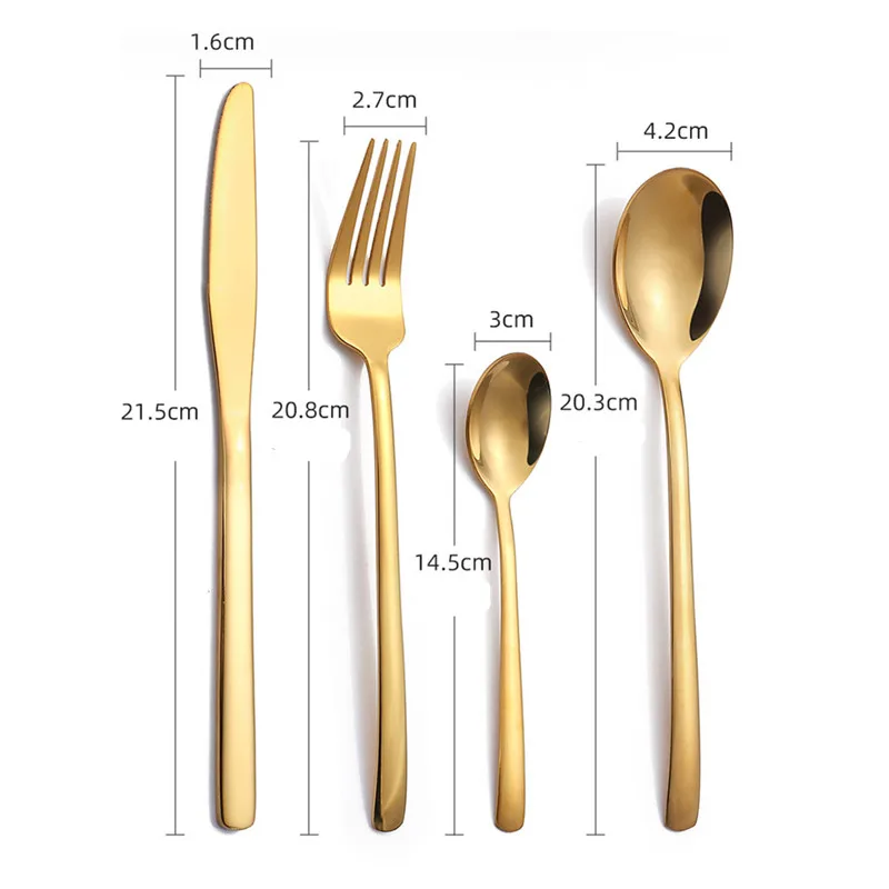 Размеры: Ножи: 21,5x1,6 см вилка: 20,8x2,7 см ложка: 20.3x4.2 см Чай ложка: 14.5x3cm