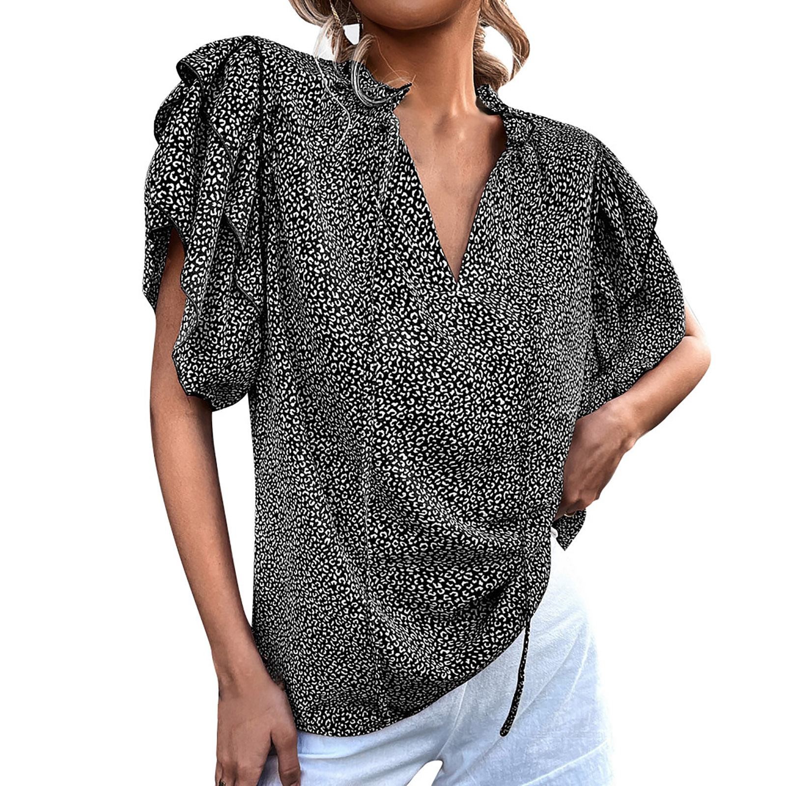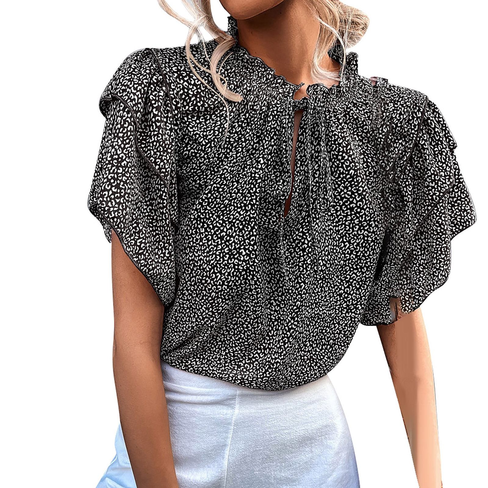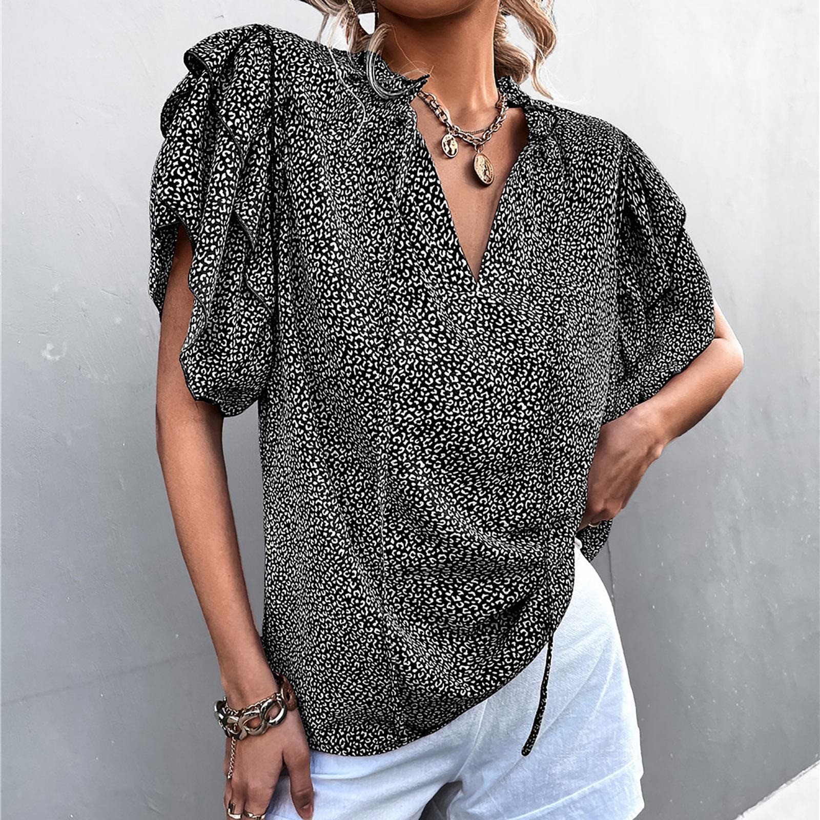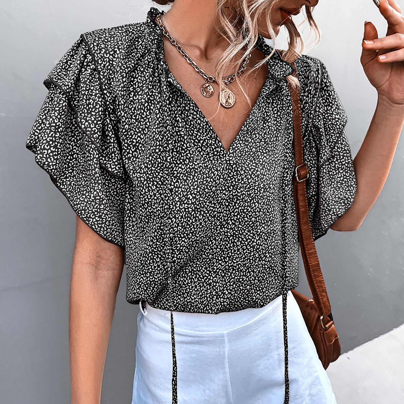 Особенности: короткие рукава, Леопардовый принт, шнуровка, v-образный вырез, расклешенные рукава, рубашка, элегантный стиль ретро.