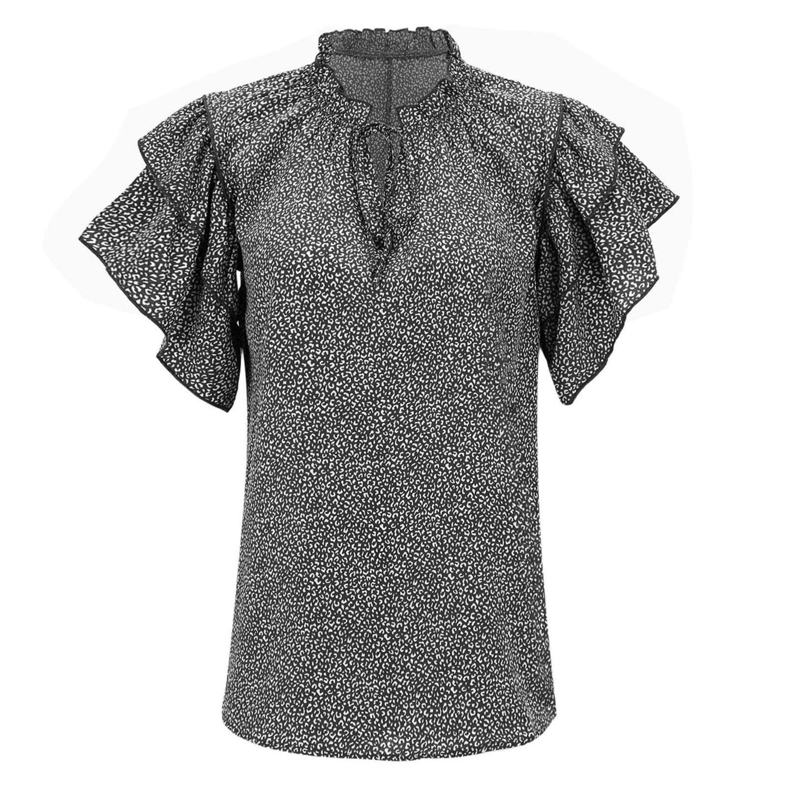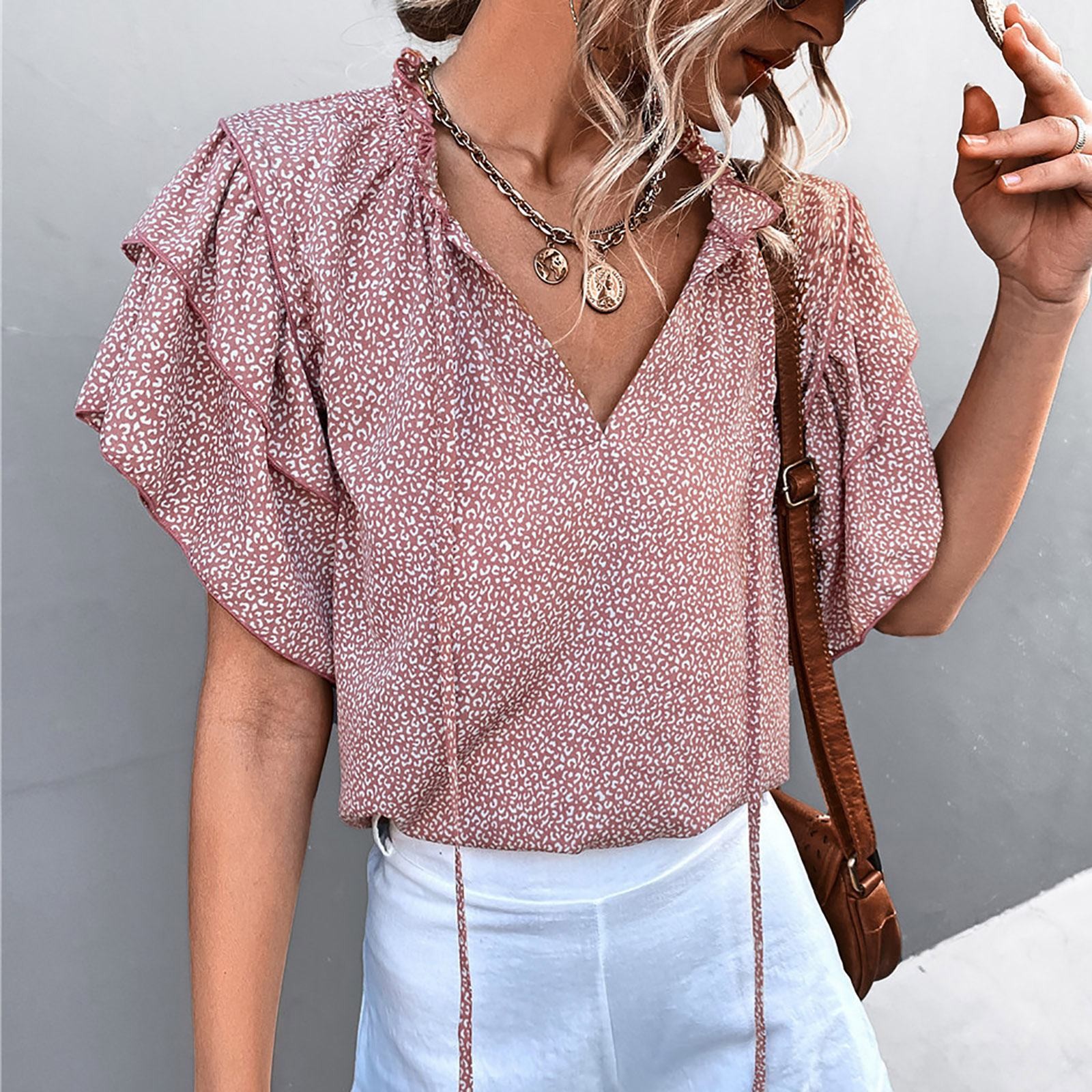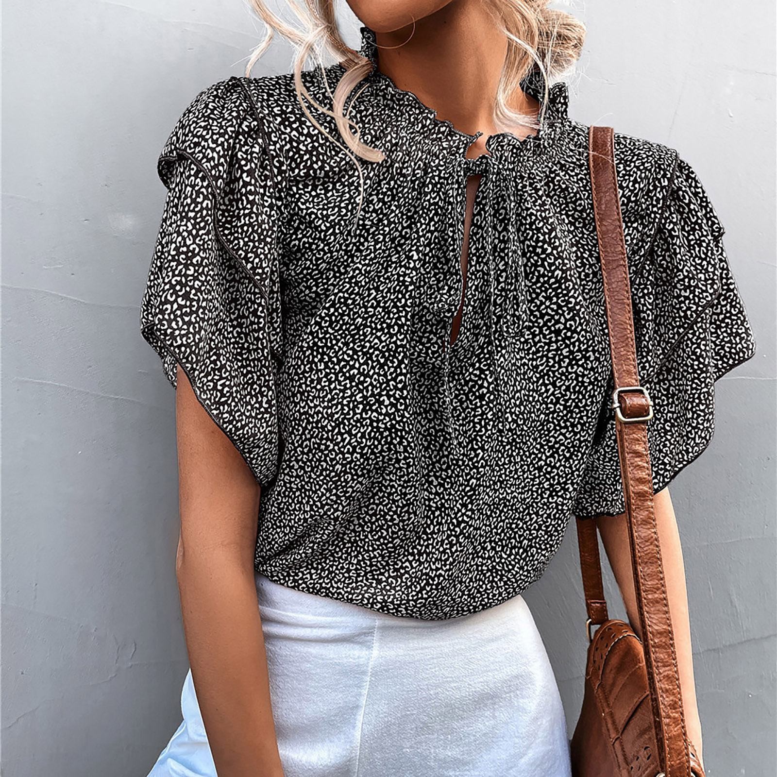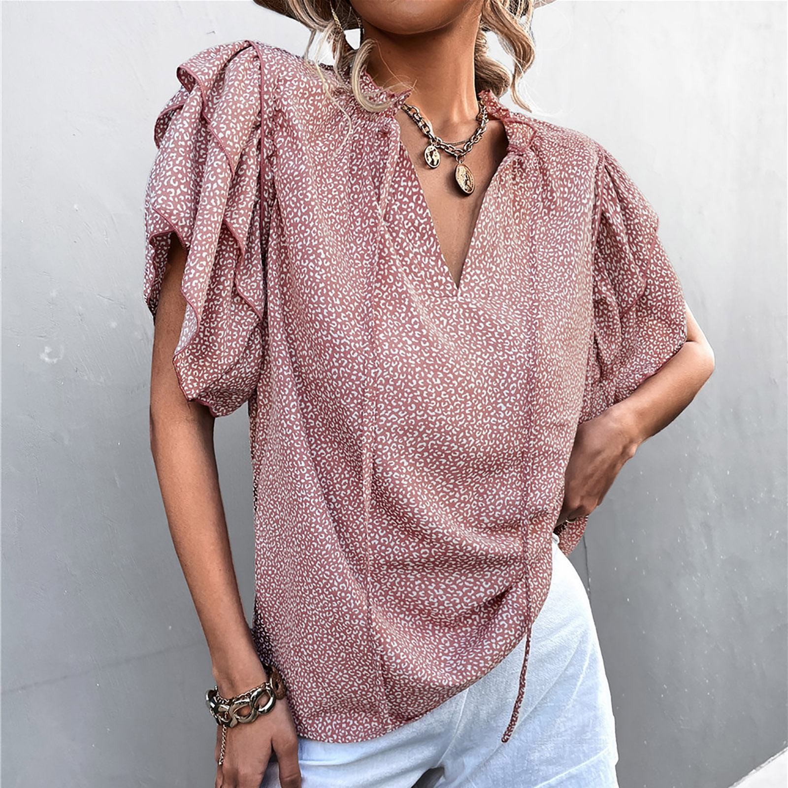 Особенности: короткие рукава, Леопардовый принт, шнуровка, v-образный вырез, расклешенные рукава, рубашка, элегантный стиль ретро.
