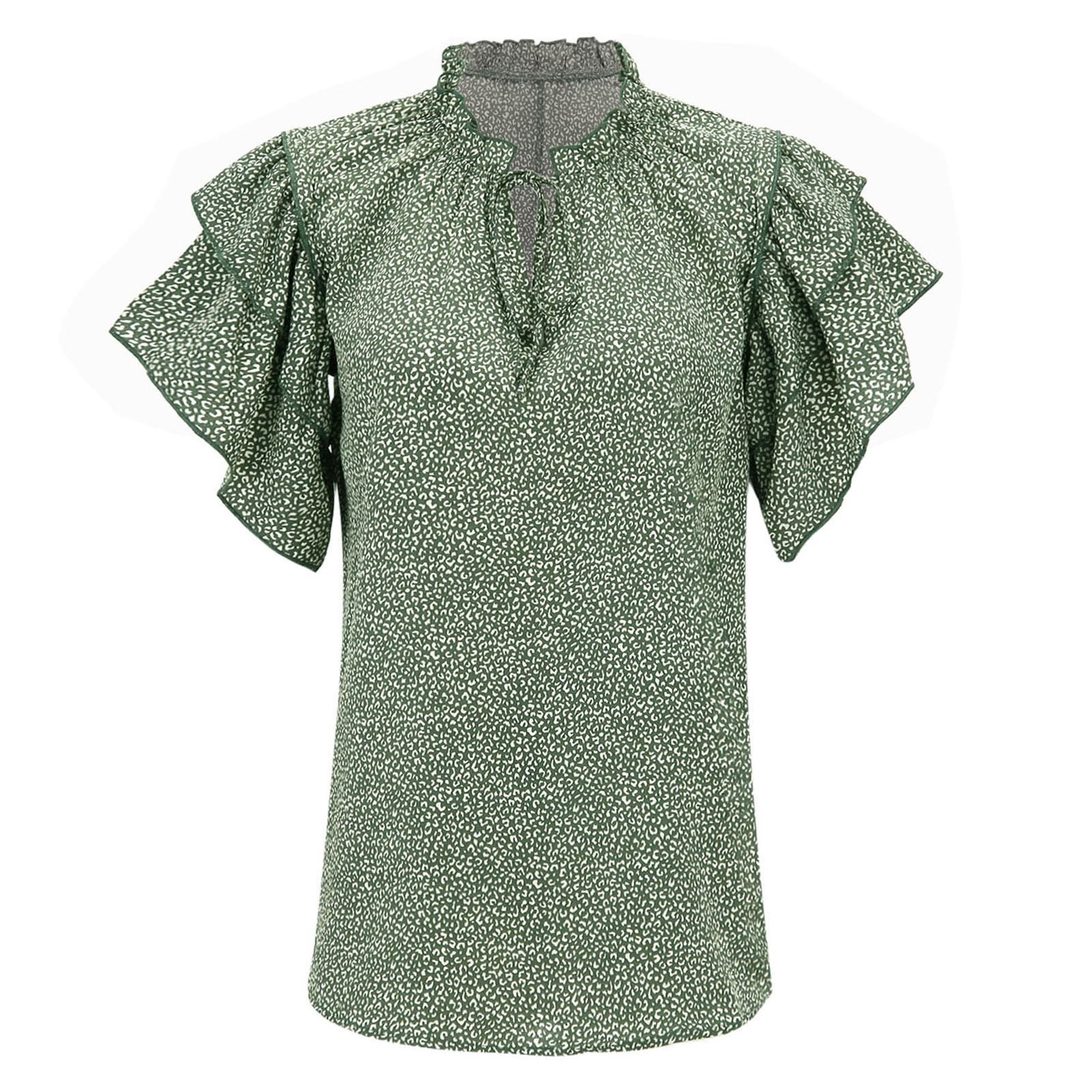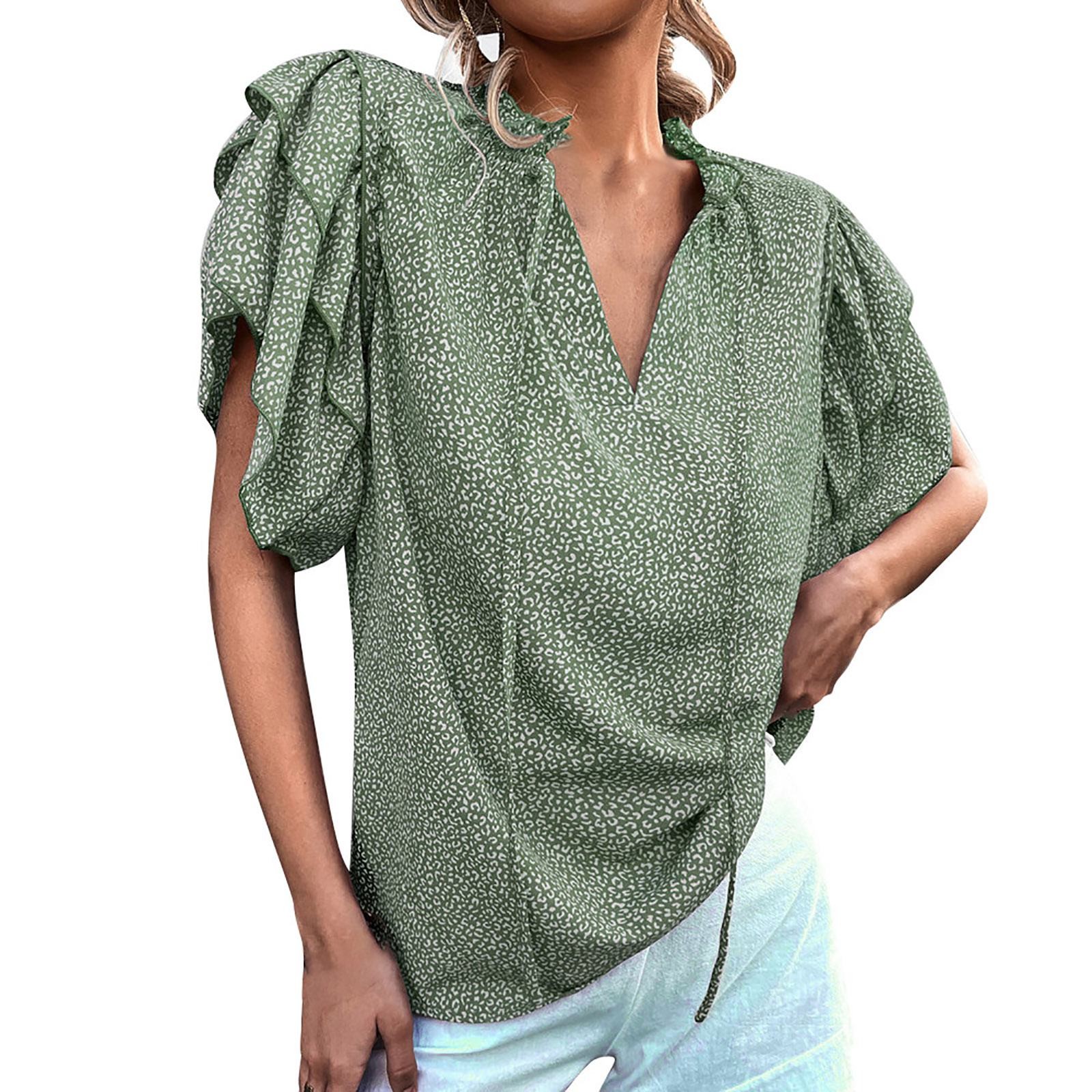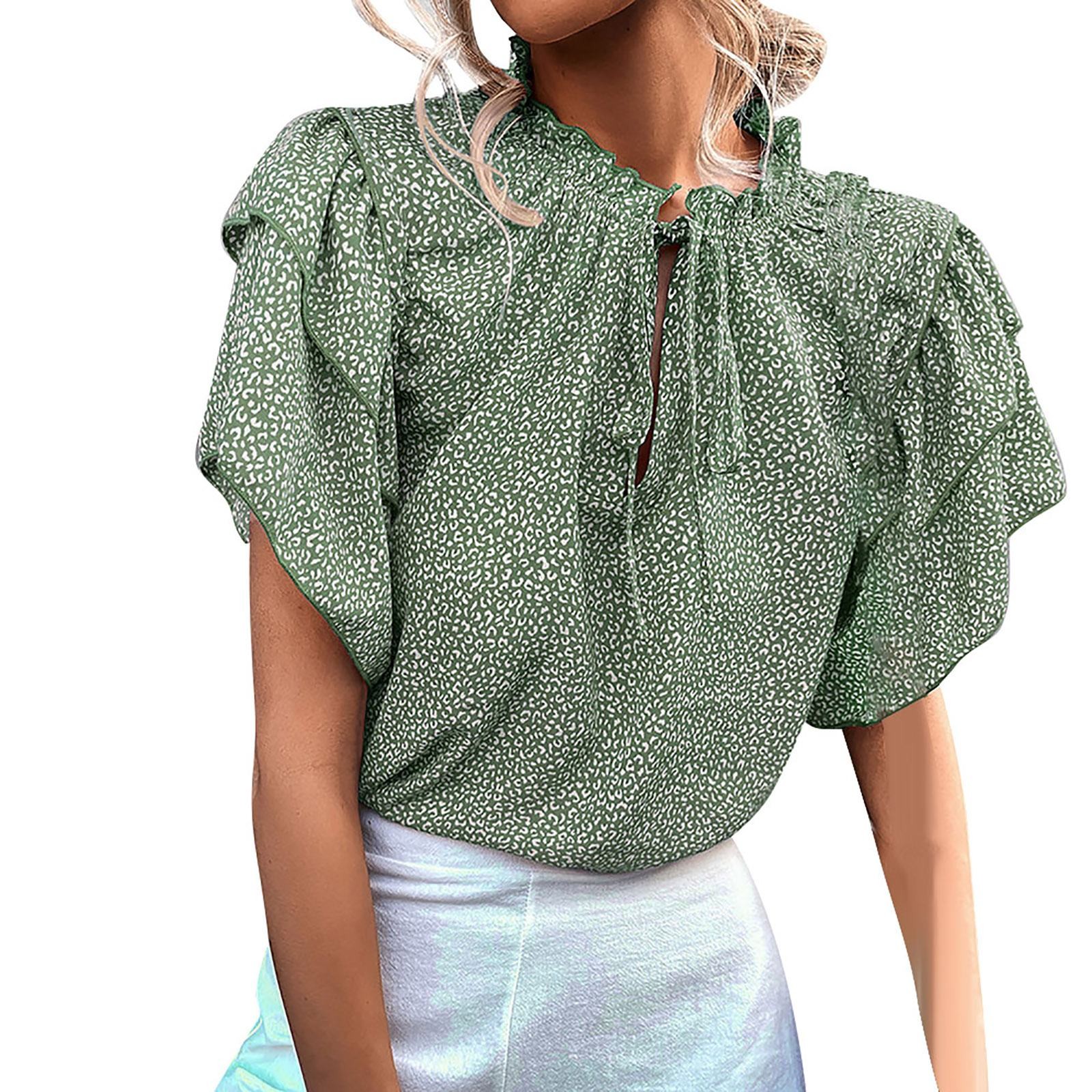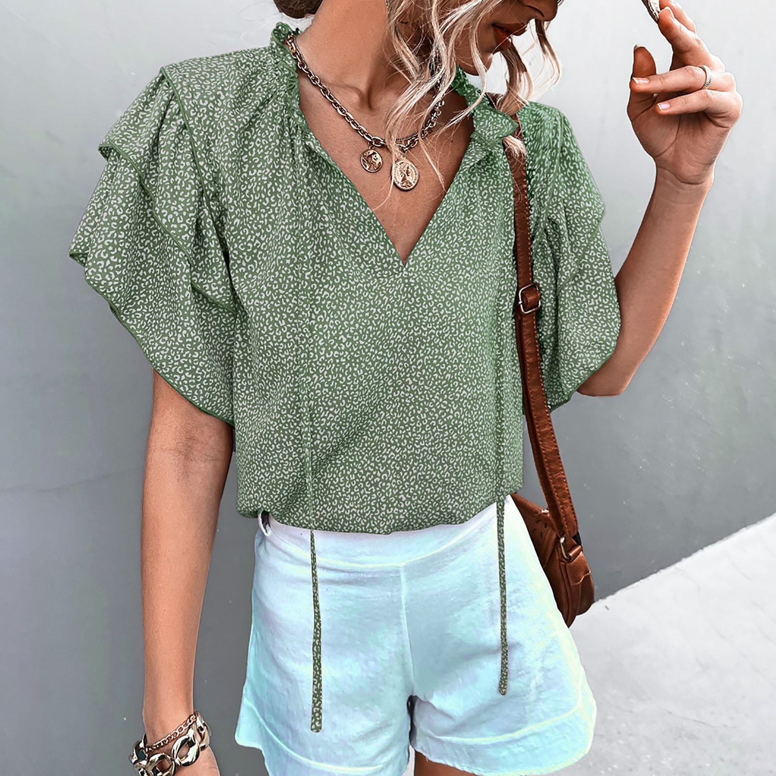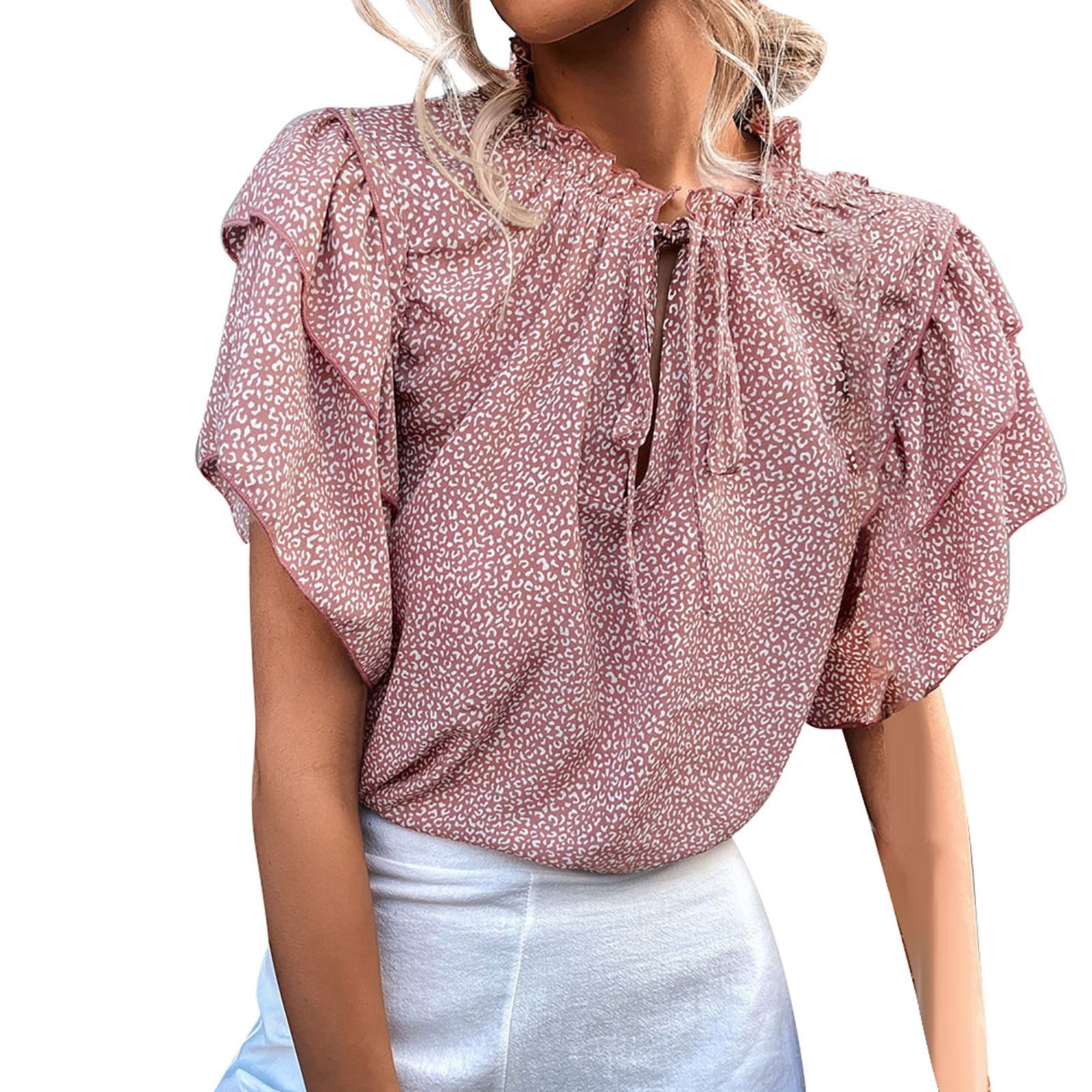 Особенности: короткие рукава, Леопардовый принт, шнуровка, v-образный вырез, расклешенные рукава, рубашка, элегантный стиль ретро.