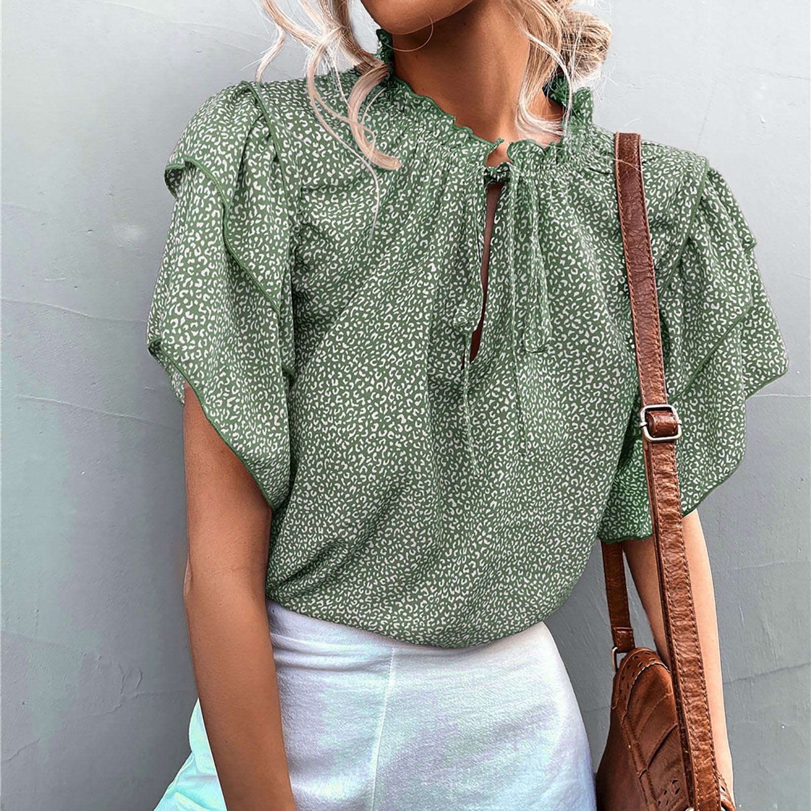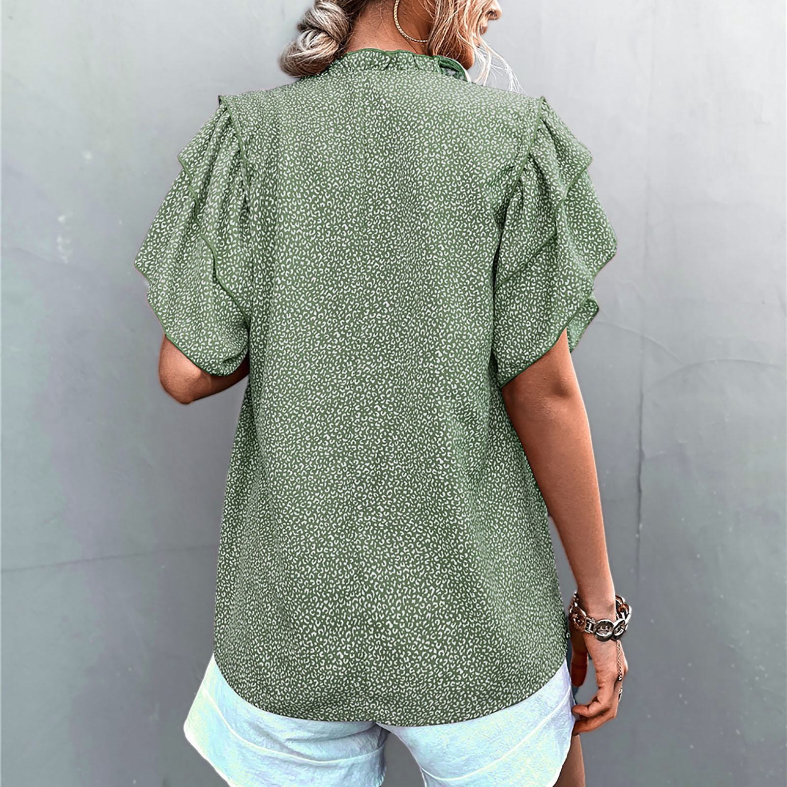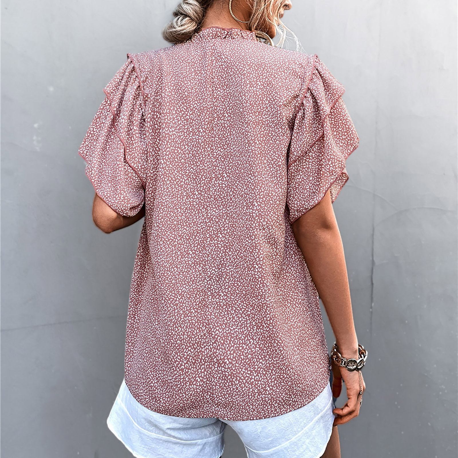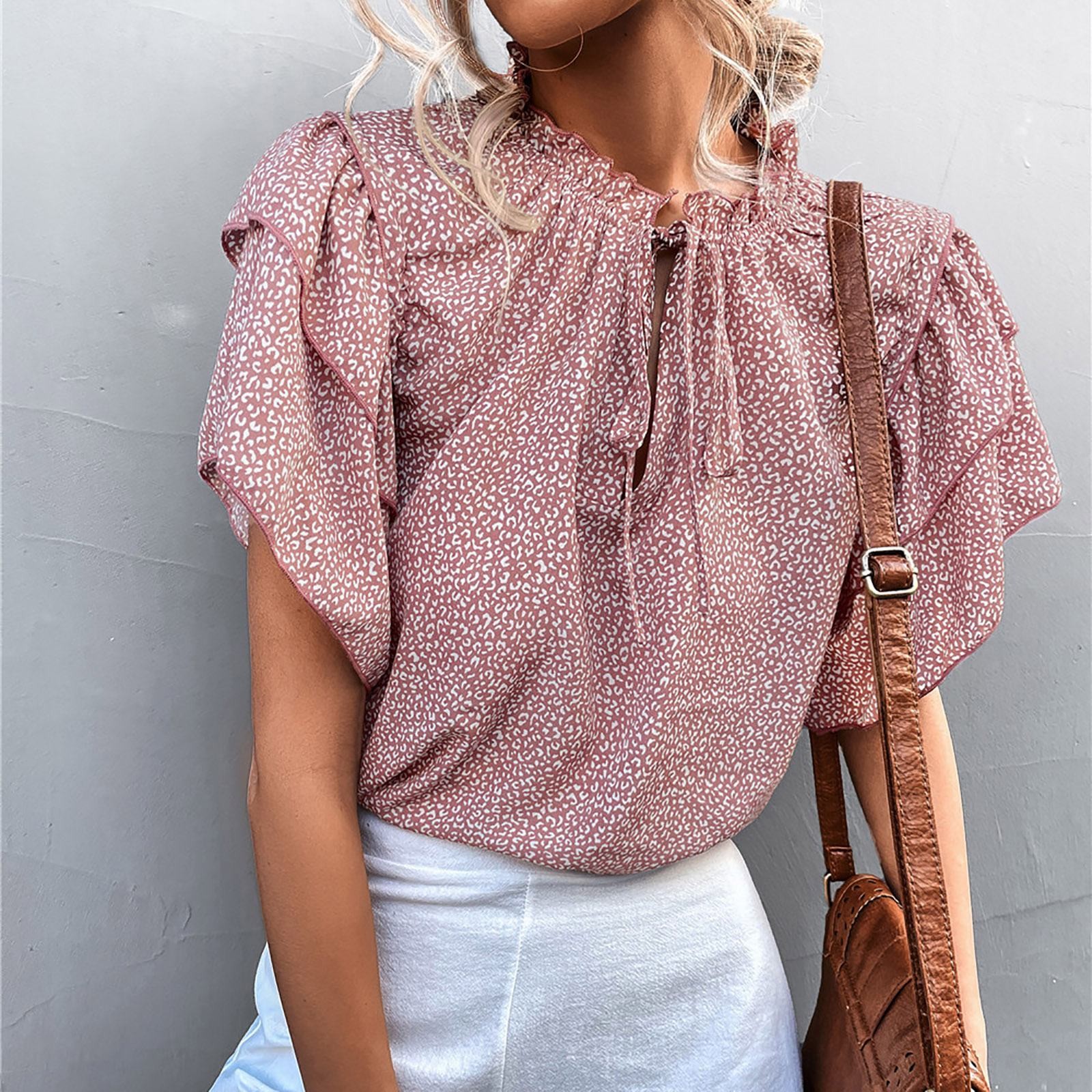 Особенности: короткие рукава, Леопардовый принт, шнуровка, v-образный вырез, расклешенные рукава, рубашка, элегантный стиль ретро.