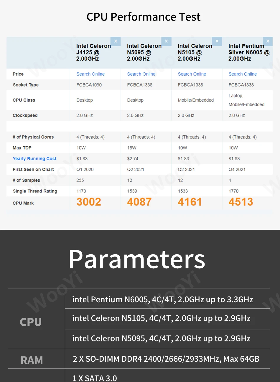 Процессор: Intel®Джаспер процессор Celeron N5105/N5095 (4C/4T, и формирующая листы для кровли 4 м Кэш, 2,0 ГГц до 2,9 ГГц)10 Вт TDP