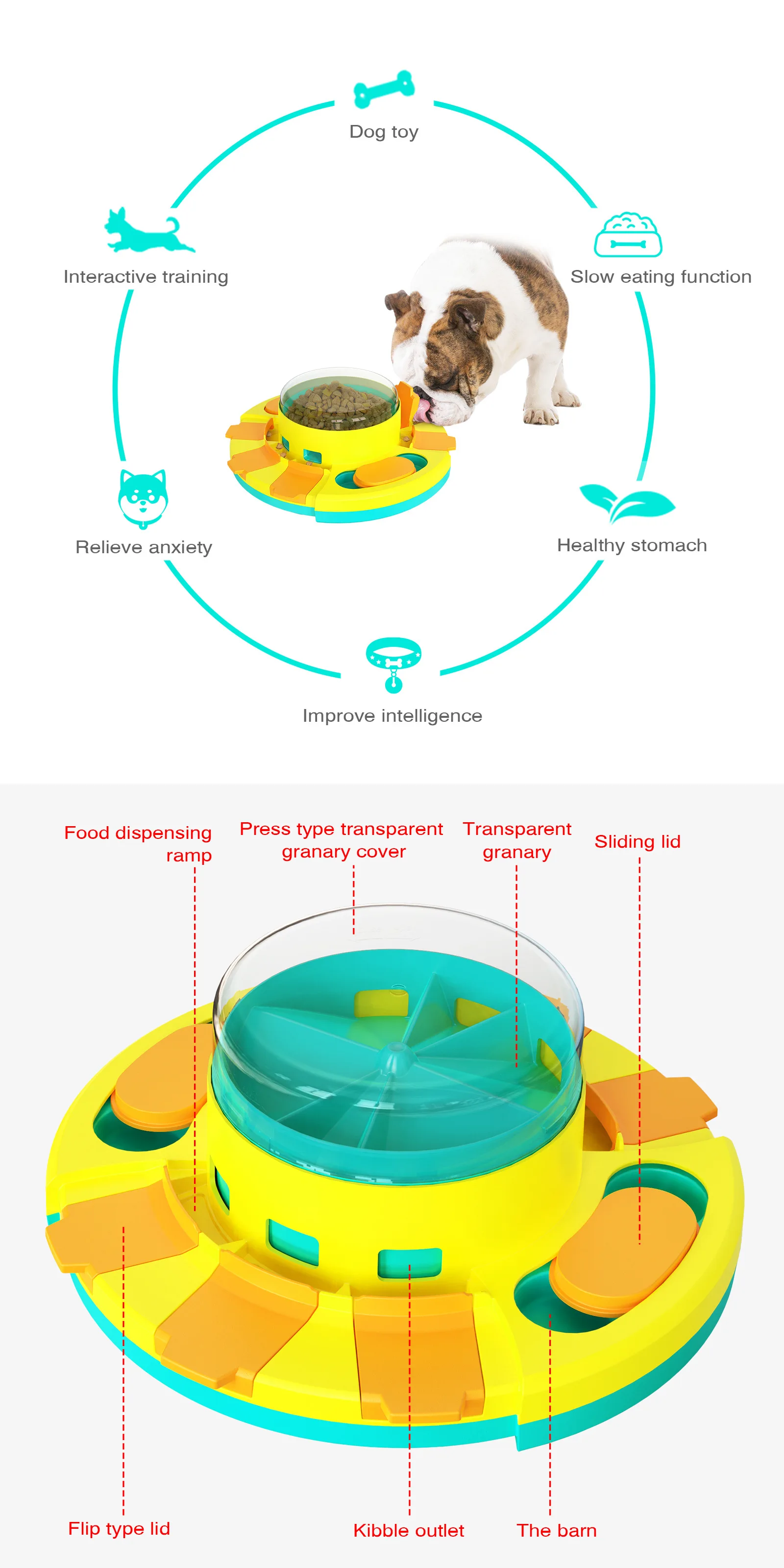 [Многофункциональная игрушка] Thisisapuzzletoyspeciallydesignedtoenhancepetsintelligence; В отличие от традиционных игрушек для отдыха домашних животных, эта игрушка позволяет вашей собаке получить награду за еду и стать более умной по своей просьбе. Он культивирует его с помощью мозга. Дизайн с антипищевым вареньем[Theupgradedpuzzletoy] itcanbeplayedwithissustylevel 1 alone или Play с уровнем сложности 1 и 2. Геймплей уровня 1: Добавьте собачьи шарики в 8 лай вокруг игрушки, 6 лай типа flip и 2 лай типа slide. Направляйте собаку, чтобы она перевернула или скользила крышку различных банок на пищевую пластину с лапой или носом, и он может получить награду за еду, играя с игрушкой. Геймплей уровня 2: собаке необходимо сначала нажать на прозрачную грануляционную крышку, и киблы будут вытекать из гранулы на 6 амбаров вокруг гранулы, И собаке нужно перевернуть крышку, чтобы получить еду.