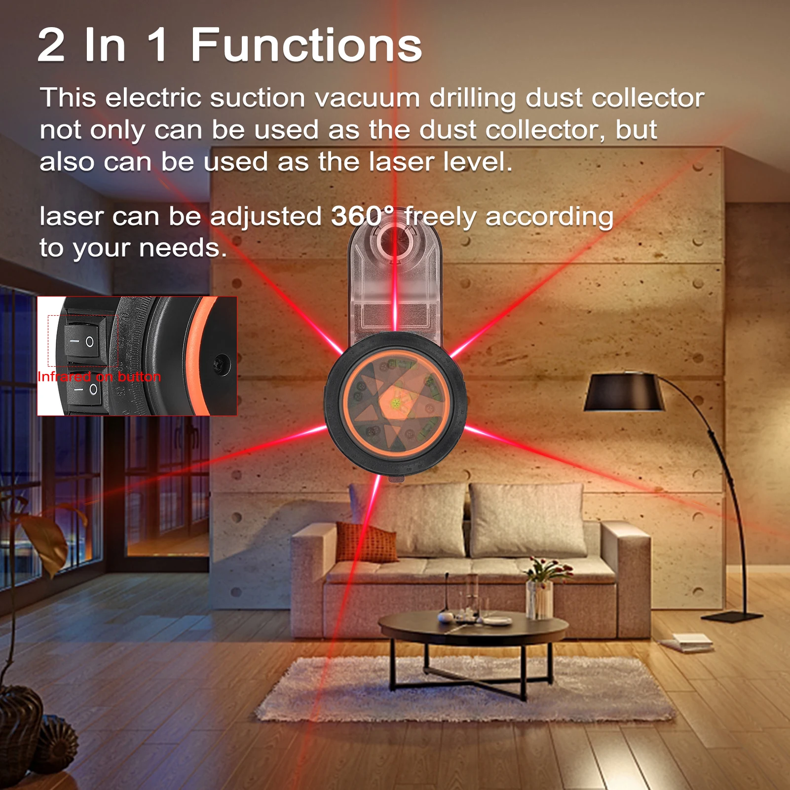 Этот Электрический вакуумный пылесборник может использоваться не только в качестве пылесборника, но и в качестве лазерного уровня. С помощью этого инструмента конструкция для бурения стен очищает и защищает от пыли, чтобы предотвратить полеты пыли. Если вы заинтересованы в этом продукте, приходите и наслаждайтесь им, это не подведет вас.