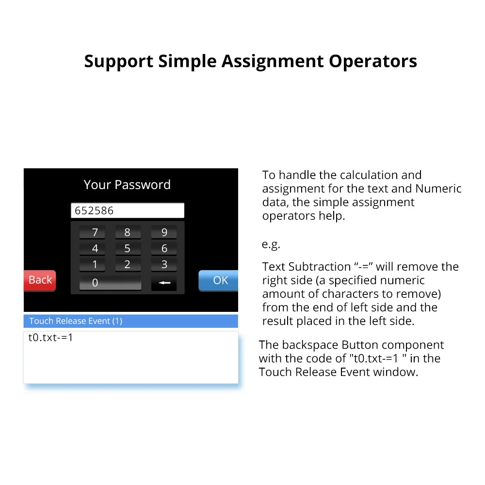 Компонент кнопки «backspace» с кодом «t0.txt-= 1» в окне события Touch Release.