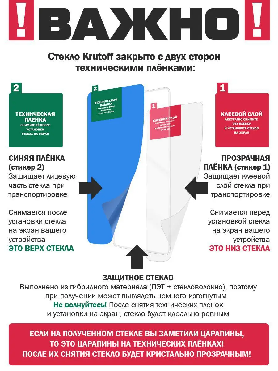 Сохранив гибкость защитной пленки, гибридное стекло намного удобнее обычного закаленного стекла - как при транспортировке, так и при установке. Оно тоньше, прочнее и надежно защищает экран от повреждений. Стекло имеет отступы по 1 мм от края дисплея для удобства ношения защитного чехла. Стекло имеет высокую степень устойчивости к царапинам, обеспечивает хорошую чувствительность к касанию и не влияет на сенсорный отклик по всей поверхности дисплея. Оно идеально прозрачное, не снижает четкость и яркость изображения, не меняет оригинальную цветопередачу экрана. Изготовлено из гибкого композиционного материала (стекловолокно и ПЭТ). Является гибким и не растрескивается, а края не крошатся, как у обычного закаленного стекла. Прочность: 9H/6MOHS. Толщина: 0.2 мм. Защита от пыли, грязи, брызг, царапин. Покрывает всю плоскую часть экрана устройства, сохраняя при этом оригинальную цветопередачу. Верхний слой из стекловолокна по тактильным ощущениям близок к стеклу и не влияет на работу сенсора по всей поверхности экрана. В два раза более высокая защита от повреждений при падении по сравнению с обычным закаленным стеклом. Высокоточная резка лазером, учитывающая все функциональные отверстия мобильного устройства. Полная проклейка поверхности (Full Glue). Специальная смесь высококачественных клеев гарантирует установку без пузырьков воздуха и что стекло не отслоится с течением времени Внимание! Гибридное стекло поставляется в двух защитных транспортировочных пленках (на тыльной и лицевой стороне). Данные пленки могут быть поцарапаны. После наклеивания стекла снимите защитную синюю пленку "2" с лицевой стороны!