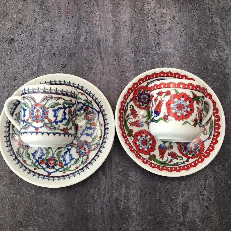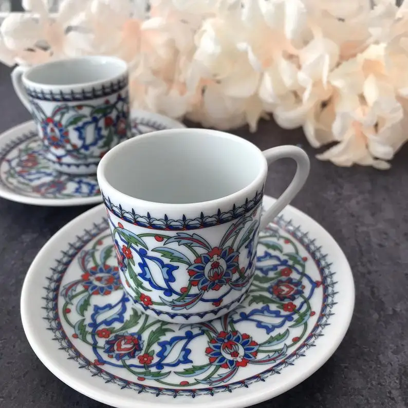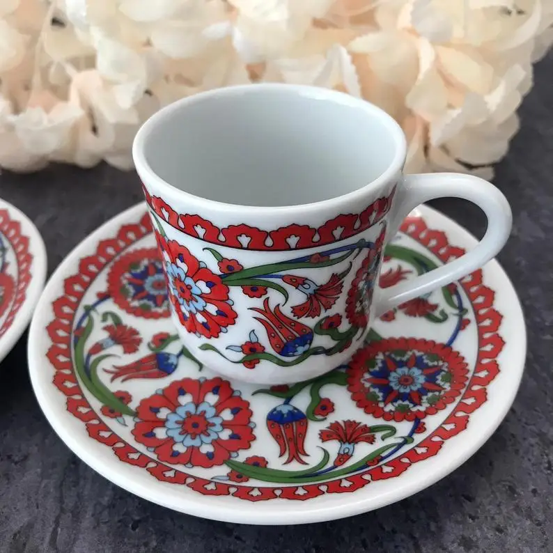 Турецкие фарфоровые кофейные чашки предназначены для продолжительного использования. В течение многих лет эти крошечные, красивые печатные чашки и блюдца сохраняли свои яркие цвета. Они отлично подходят для турецкого, эспрессо или арабского кофе. Идеальный размер для большого изящного стиля с маленькими глотками.