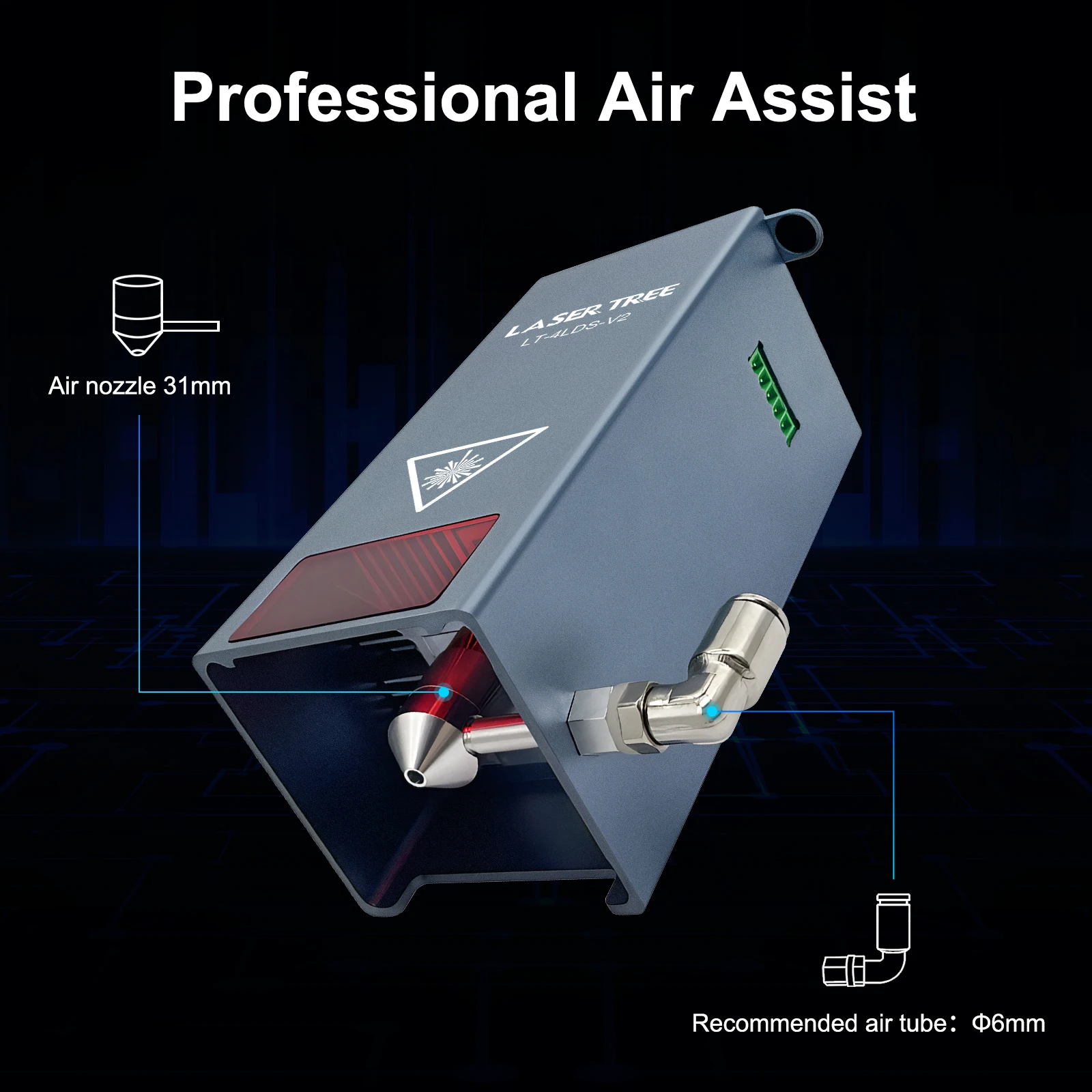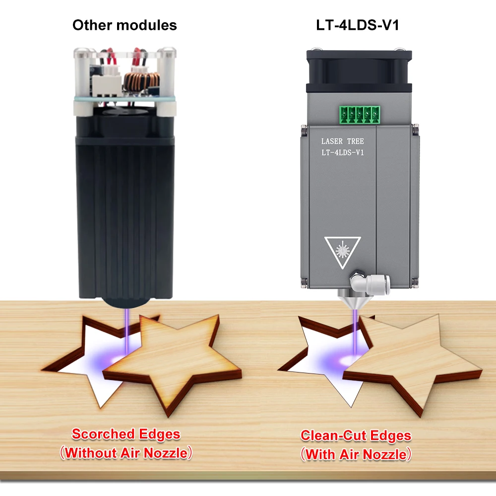 При резке с помощью этой лазерной головки система air assit будет выдувать воздух через воздушное сопло. Это принесет вам отличный опыт резки и значительно уменьшит количество ожогов.