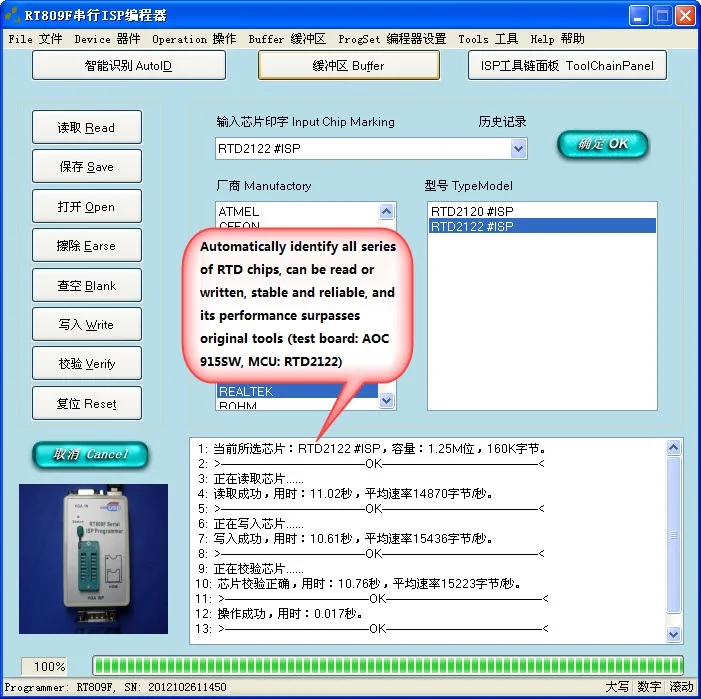 7) это единственный программист, который имеет функцию поддержки чипа RTD2120, два банка читает и записывает онлайн. Включая BANK0, который входит в прошивку, и BANK1 область, в которой меню. Он может читать двойной банк всего за 6 секунд. Поддерживает три банка RTD2122 для чтения и записи онлайн.