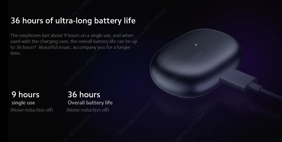 Время непрерывной работы (50% громкости): с уровнем твердости 9h ANC (наушники)/36h ANC OFF (с зарядный чехол)