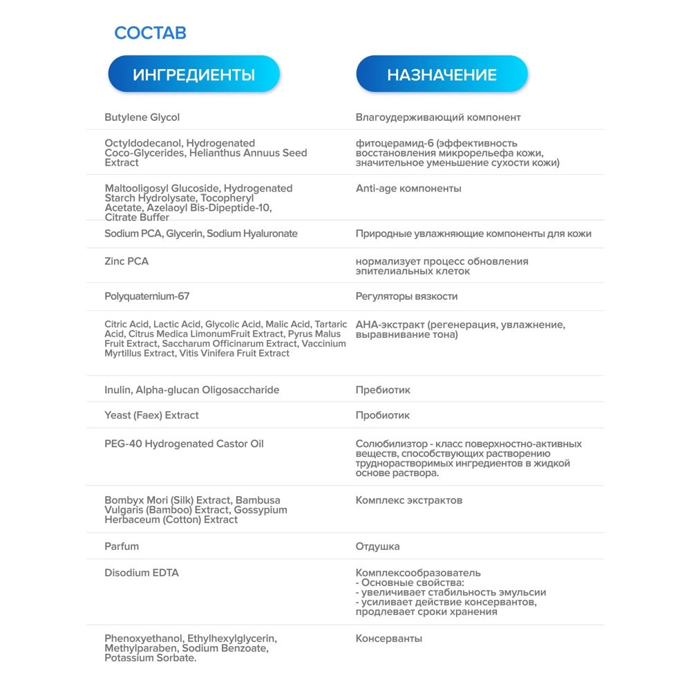 | Состав | Aqua, Glycerin, Butylene Glycol, Sodium PCA, PEG-40 Hydrogenated Castor Oil, Maltooligosyl Glucoside, Hydrogenated Starch Hydrolysate, Glycine, Inulin, Alpha-glucan Oligosaccharide, Yeast (Faex) Extract, Polyquaternium-67, Parfum, Zinc PCA, Tocopheryl Acetate, Sodium Hyaluronate, Arginine, Lactic Acid, Bombyx Mori (Silk) Еxtract, Bambusa Vulgaris (Bamboo) Extract, Gossypium Herbaceum (Cotton) Extract, Azelaoyl Bis-Dipeptide-10, Citrate Buffer, Octyldodecanol, Hydrogenated Coco-Glycerides, Helianthus Annuus Seed Extract, Disodium EDTA, Phenoxyethanol, Ethylhexylglycerin, Methylparaben, Sodium Benzoate, Potassium Sorbate. |