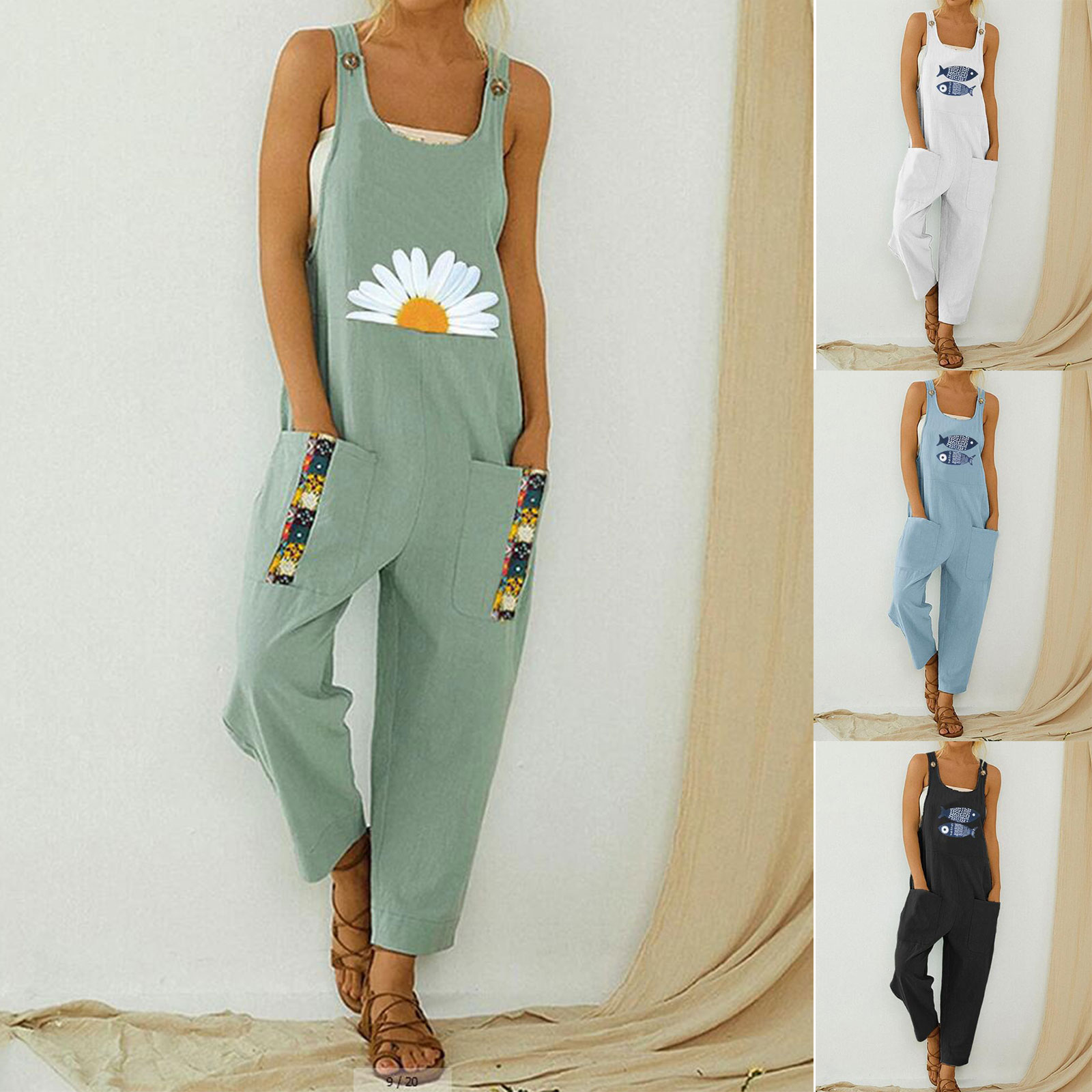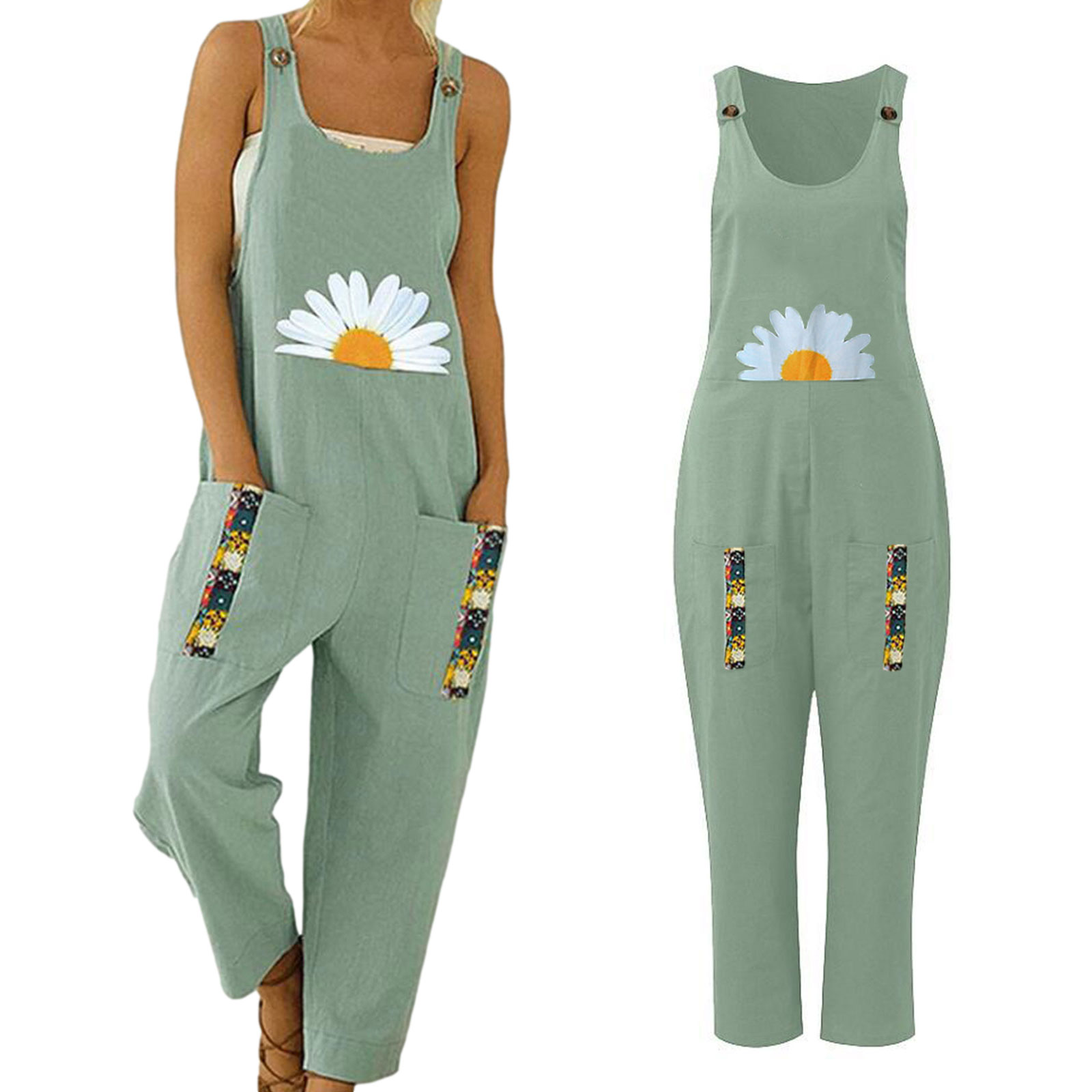 Female Overall Pants, Floral Print Sleeveless Jumpsuit with Pockets