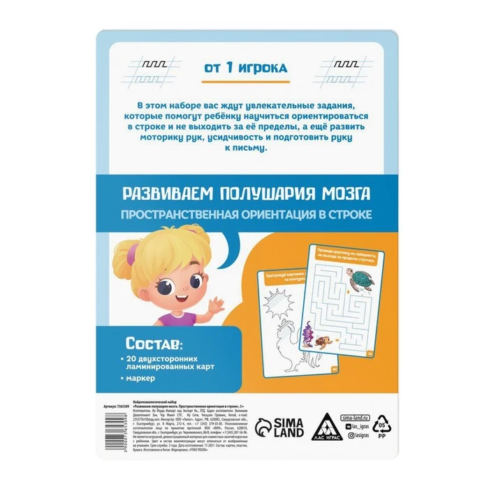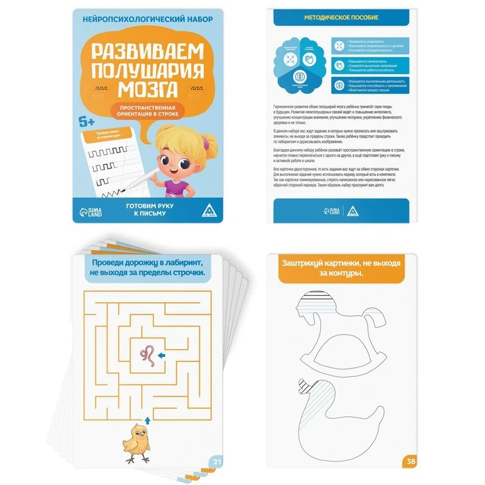Играем и развиваем полушария мозгаВ этом наборе ребёнка ждут увлекательные задания, которые помогут ему научиться ориентироваться в строчке, а ещё развить моторику рук и усидчивость.