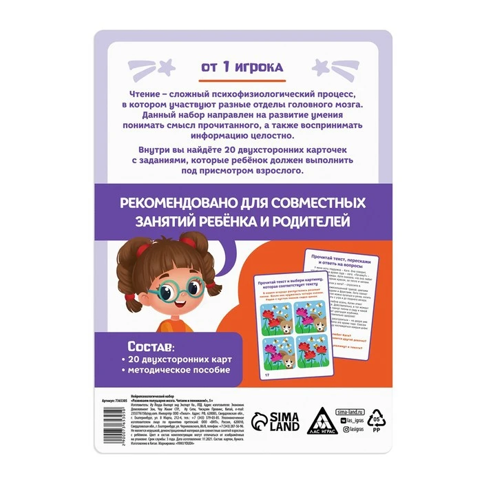 В наборе ребёнка ждёт 20 двухсторонних карточек с заданиями, которые он должен выполнить под присмотром взрослого.