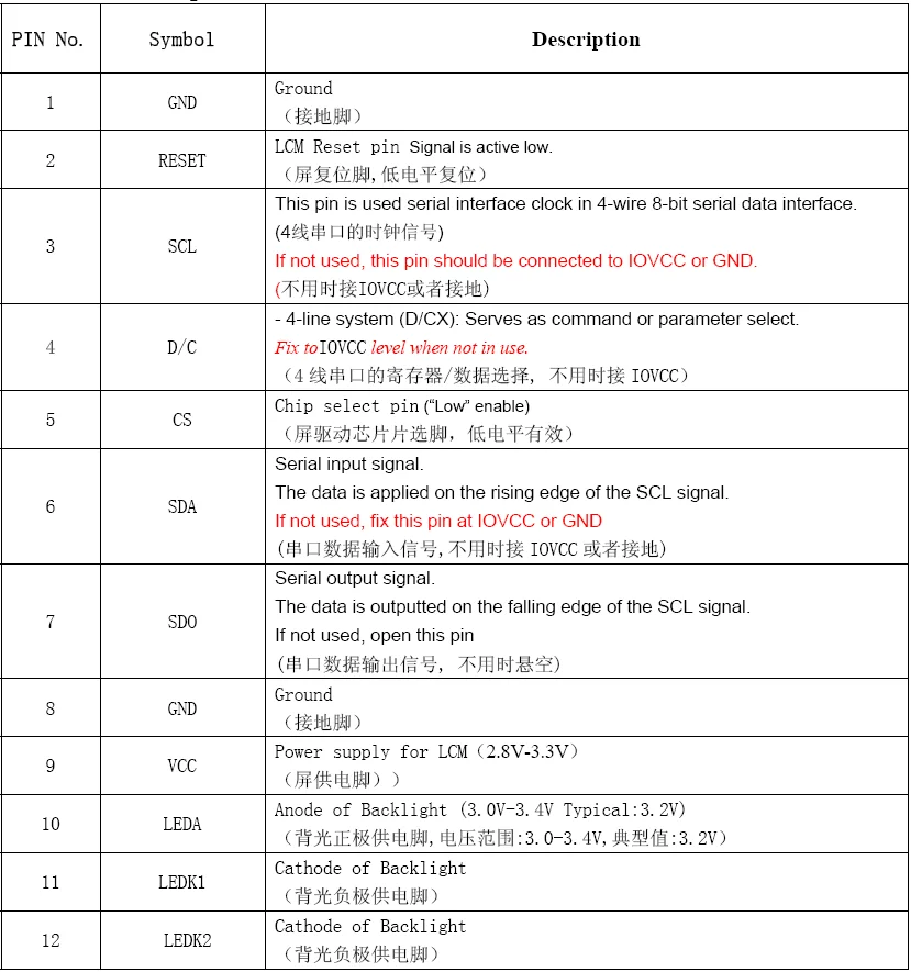 3,2 дюймовДрайвер IC ILI9341Разрешение: 240 * RGB * 320Чип драйвера: ILI9341Интерфейс Тип: 4-провод последовательный порт SPIВысота штифта: 0,8 ммРазмеры: 77,4*54*3,75 мм (с касанием)77,4*54*2,55 мм (без касания)Размер дисплея: 48,6*64,8 ммТип подсветки: светодиодный * 6 ток 90 мАНапряжение: Рабочее напряжение VDD = 2,8 V-3,3 VОбщая потребляемая мощность: 0,32 ВтРабочая температура: -20 ℃-+ 70 ℃Температура хранения: -30 ℃-+ 80 ℃Угол обзора: 12:00 часовТип подключения: сварка