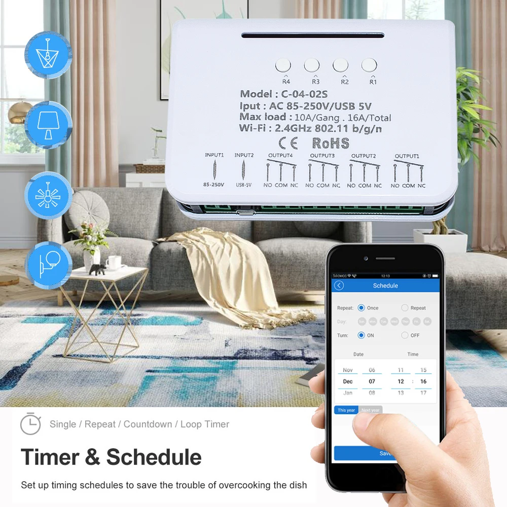 * Поддерживает Макс 8 включенных таймеров по расписанию/обратному отсчету/циклу для каждого устройства.