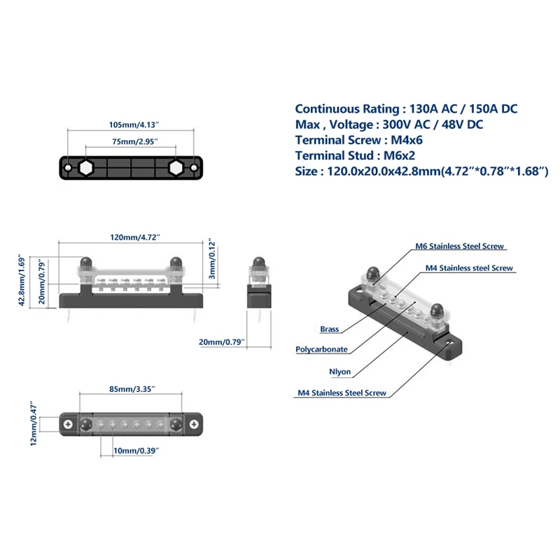 Ключевые параметры-непрерывный ток: 130A AC/150A DC; Максимальное напряжение 300 В AC/48 В DC; Клеммные Винты: M4 x 6; Штапельные столбы: M6 x 2