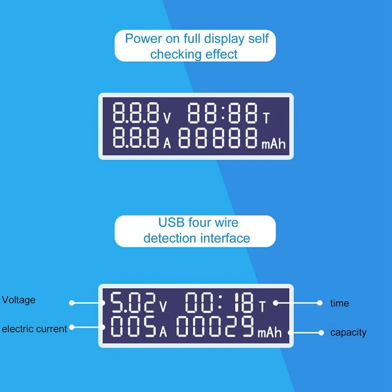 1. Interface design display: Multi-angle high-definition LCD display design is adopted. Long press the reset button to quickly time T and clear the capacity mAH.