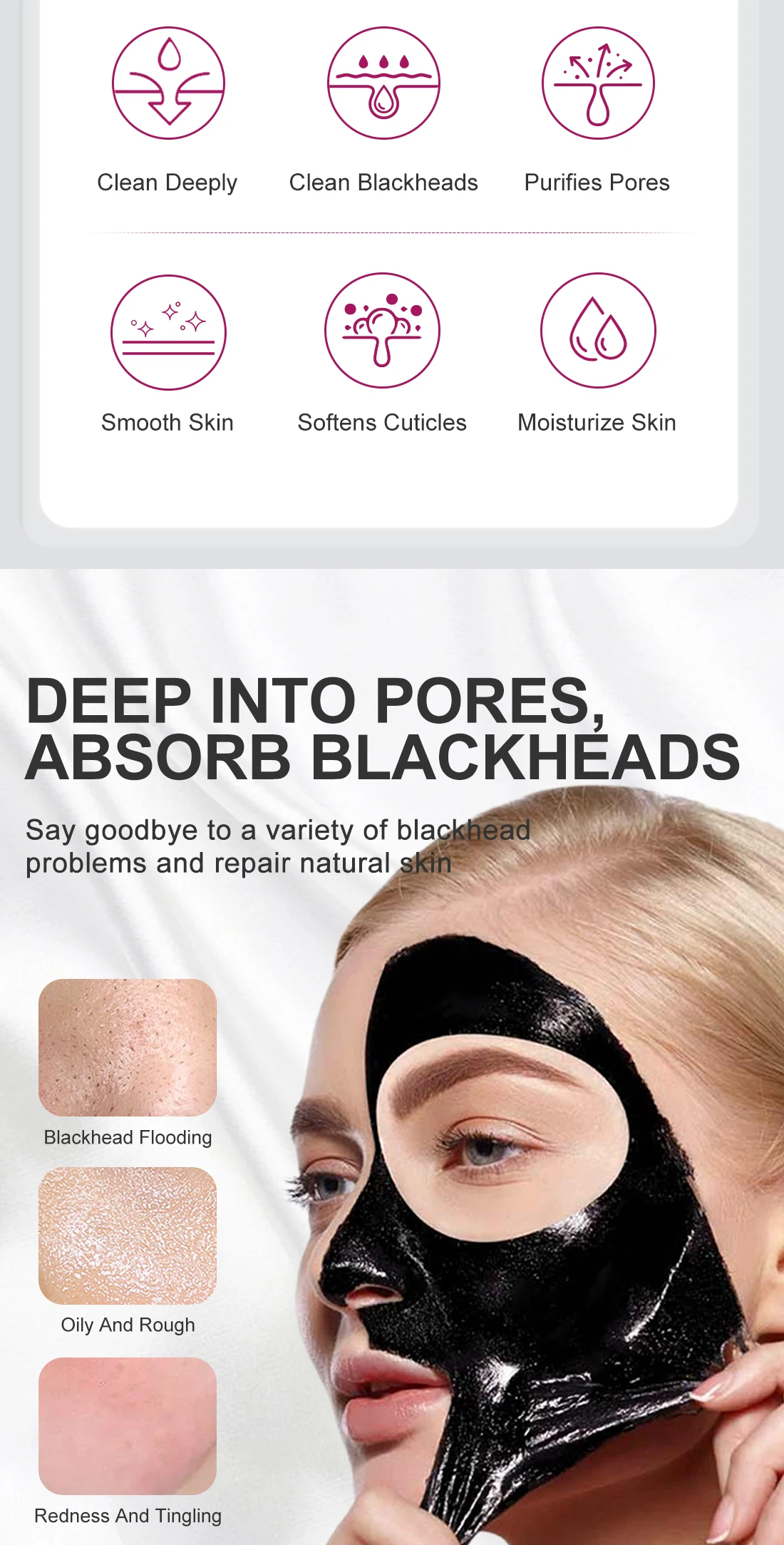 Богатый экстрактом манго, может глубоко проникать в поры, смягчать кожу cutin и адсорбировать черную голову, удалять грязь, масло и черные точки в поры, очищать, увлажнять кожу и сужать поры, улучшите сухость и грубые проблемы с кожей, подарите вам нежное и гладкое состояние кожи.
