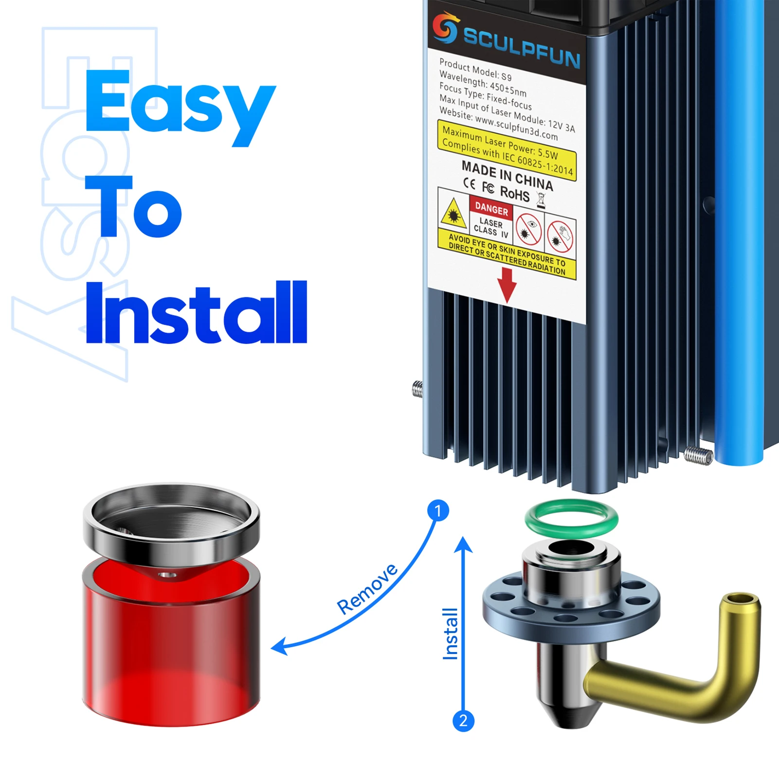 SCULPFUN S9 Air Assist: это Цельнометаллическая конструкция и идеально сочетается с лазером S9. Установка очень простая, и вам нужно всего несколько минут для установки.
