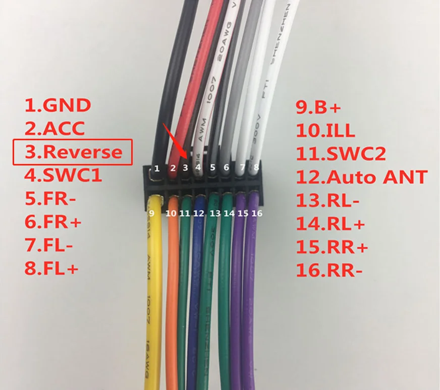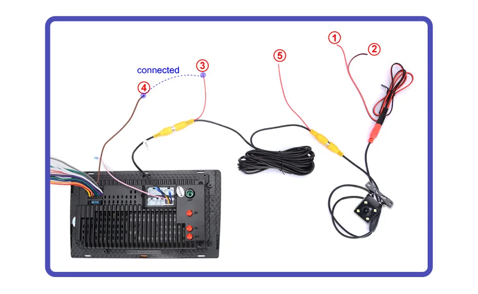 3. Кабель для обнаружения заднего хода ④ (коричневый цвет, обратный кабель) подключен к красному кабелю ③ который удлиняется от входного кабеля видео