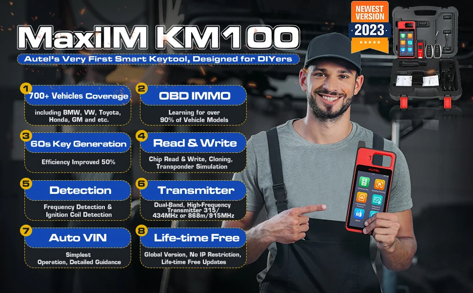 MaxiIM KM100 является передовым ключом и иммобилайзером сенсорного планшета, способным создавать смарт-ключ и обучение IMMO через OBD. Этот 5,5 дюймов, Android планшет сенсорного экрана с Bluetooth VCI может запрограммировать Autel IKEY как смарт-ключ заменой более чем 700 транспортных средств и предлагает IMMO возможности программирования для нескольких транспортного средства самых лучших брендов, в том числе для BMW, для Volkswagen, toyota, Honda и General Motors. Дополнительные инновационные функции включают обновление ключа и транспондер редактирования 20 поддерживаемых протоколов.
