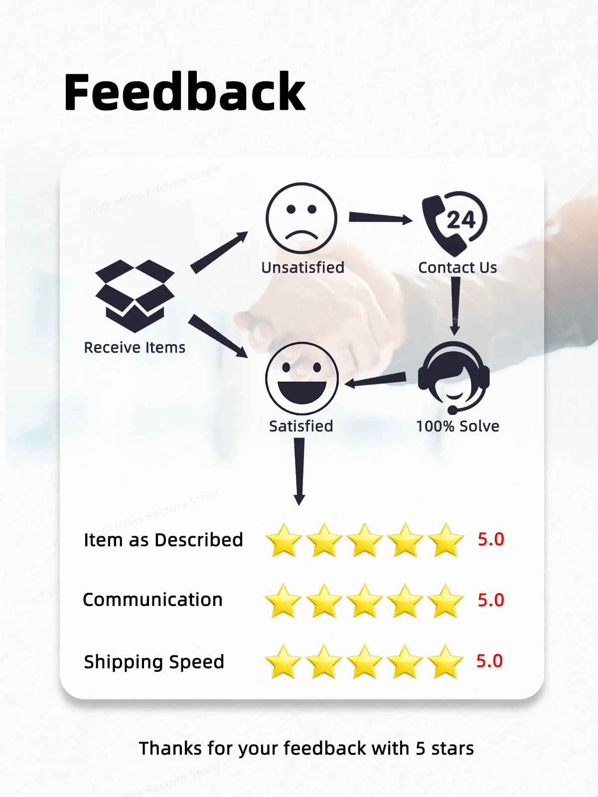 3. Для пятизвездочного покупателя мы предоставляем гарантию на 1 год еще дольше и приложим большие усилия для удовлетворения ваших потребностей. Для покупателя отрицательного отзыва, мы будем усердно работать, чтобы улучшить себя, но больше не будем делать никаких услуг.