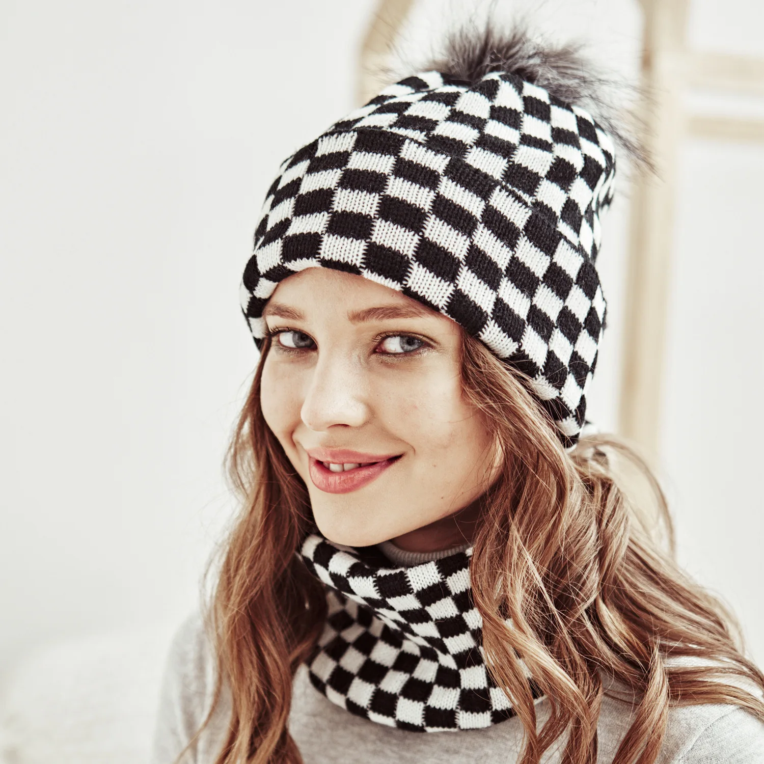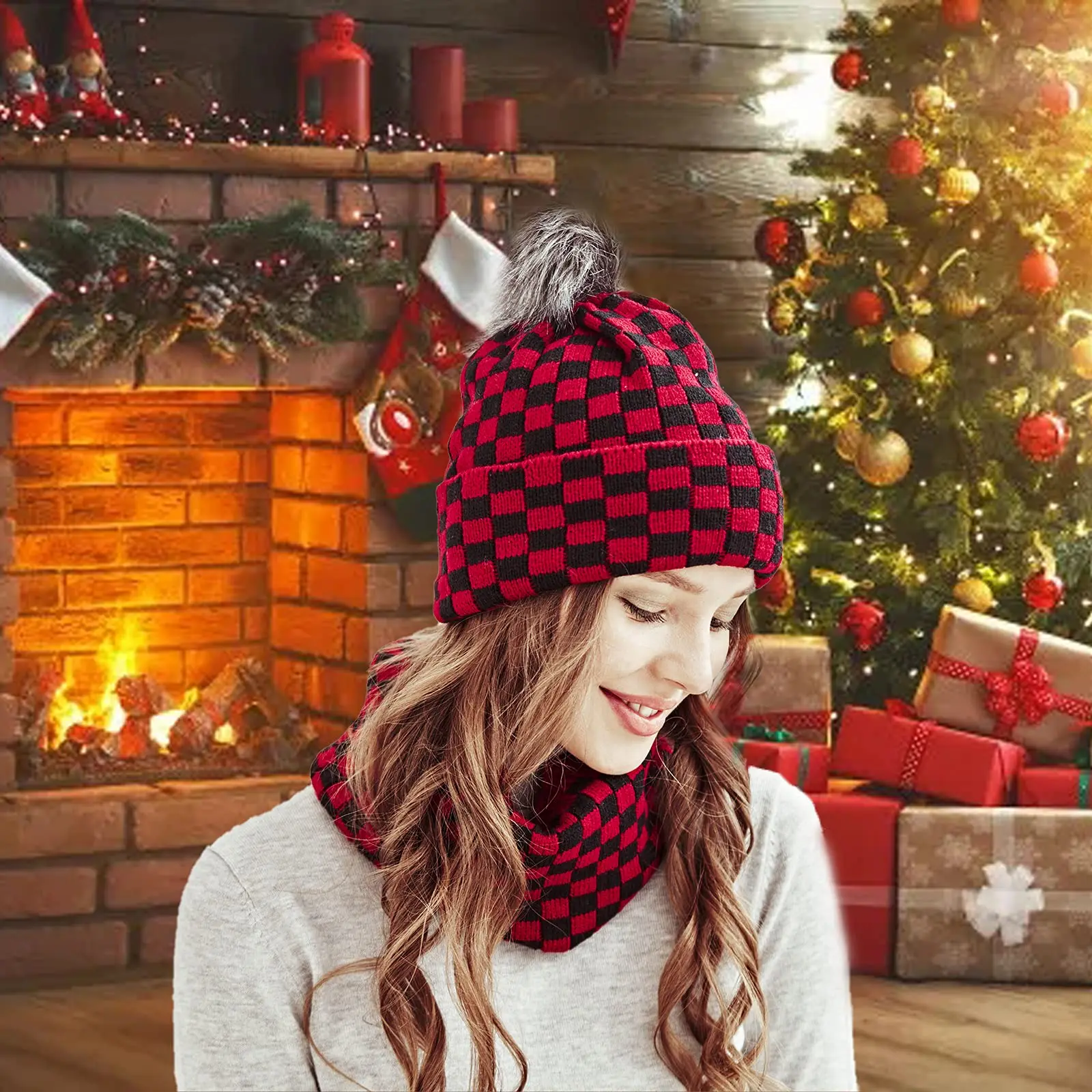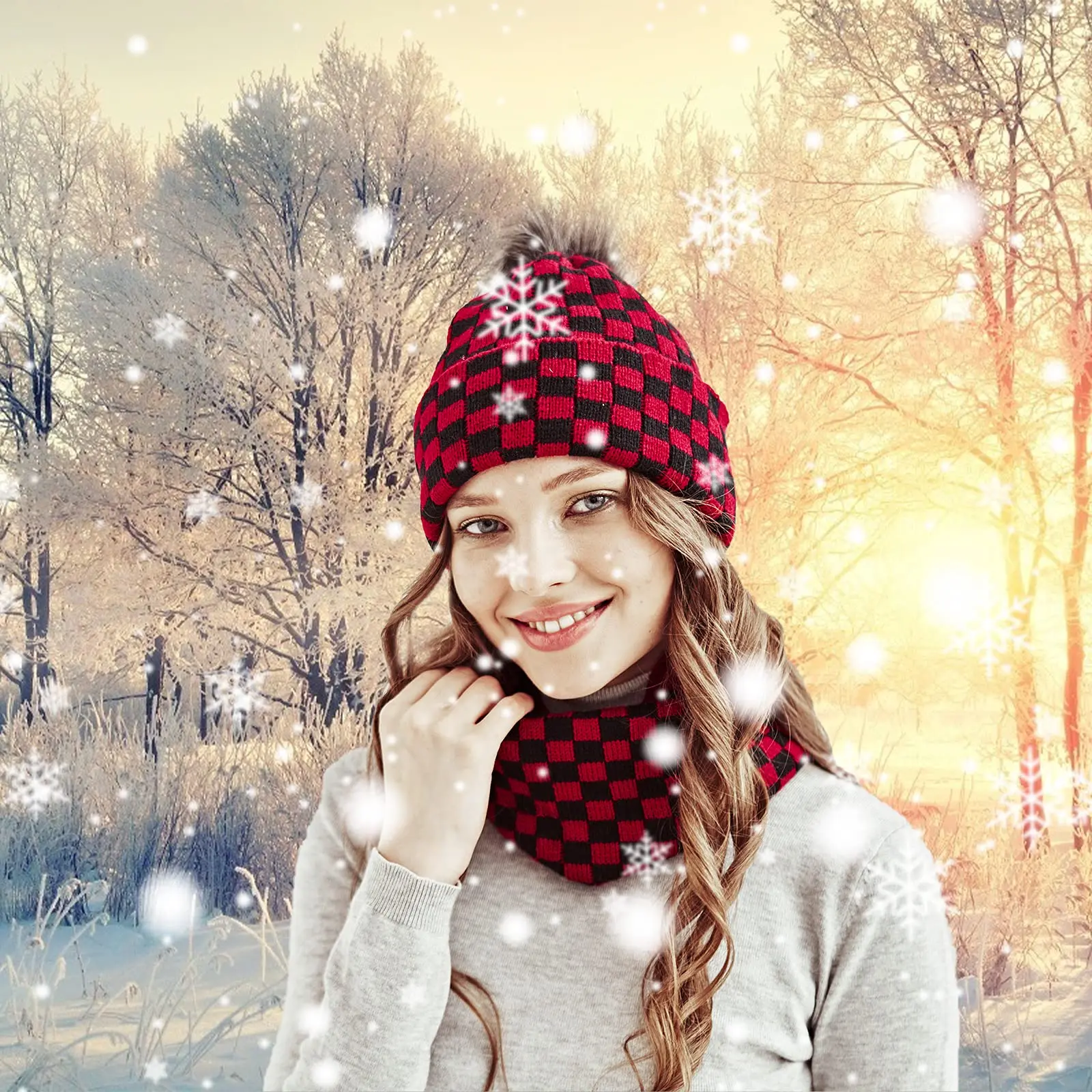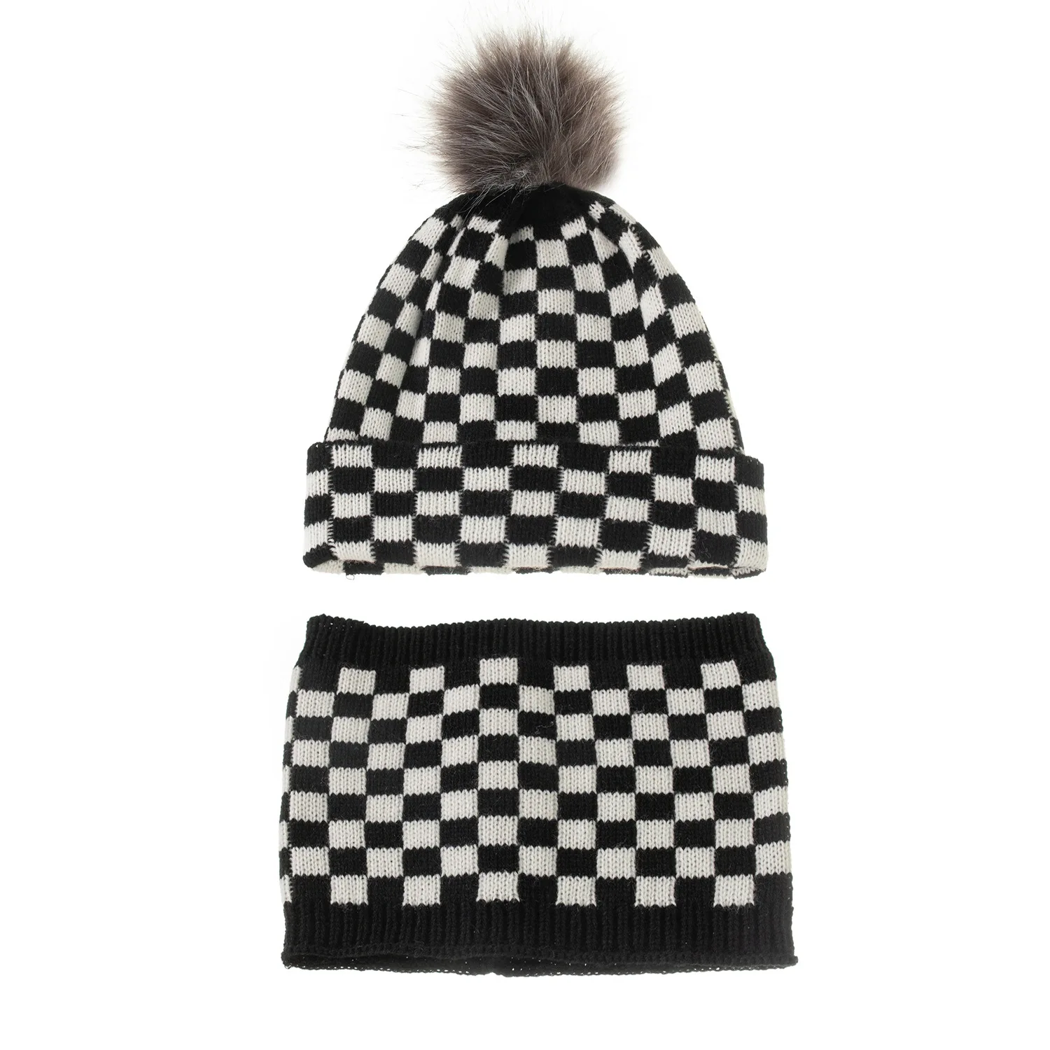 2022 New Women Plaid Hat Scarf Set Winter Pom Pom Balls Beanie Cap Female Bonnet Outdoor Neck Warmer Scarves Adult Caps