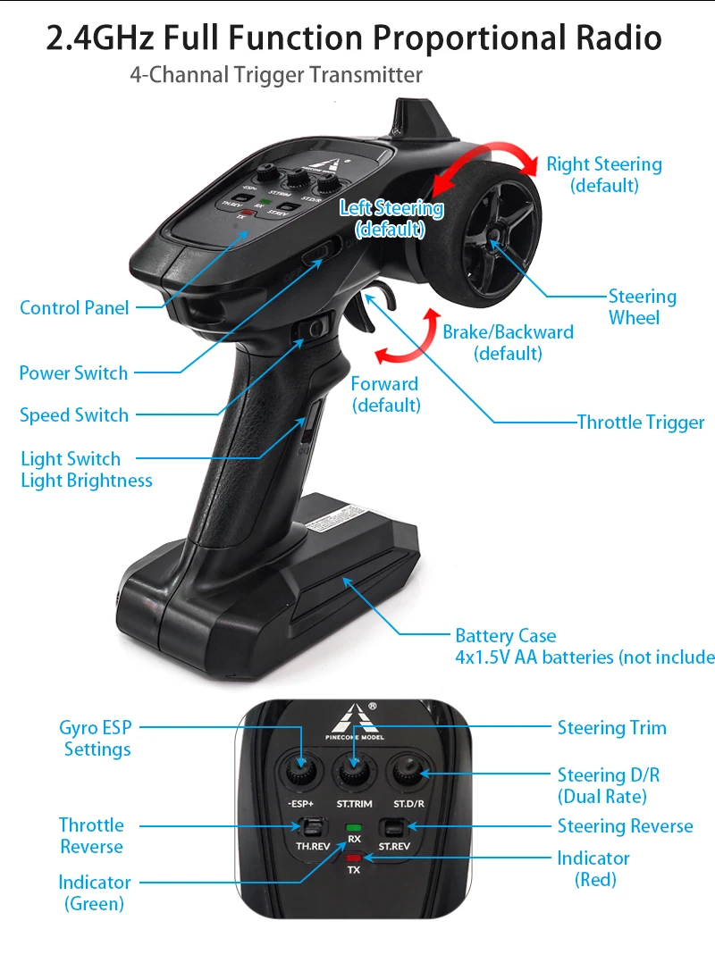 ● Эта модель оснащена полномасштабными синхронными функциями управления, такими как вращение вперед, назад, влево и вправо, торможение и т. д., а также защита от перезаряда батареи и защита от перегрузки по току.