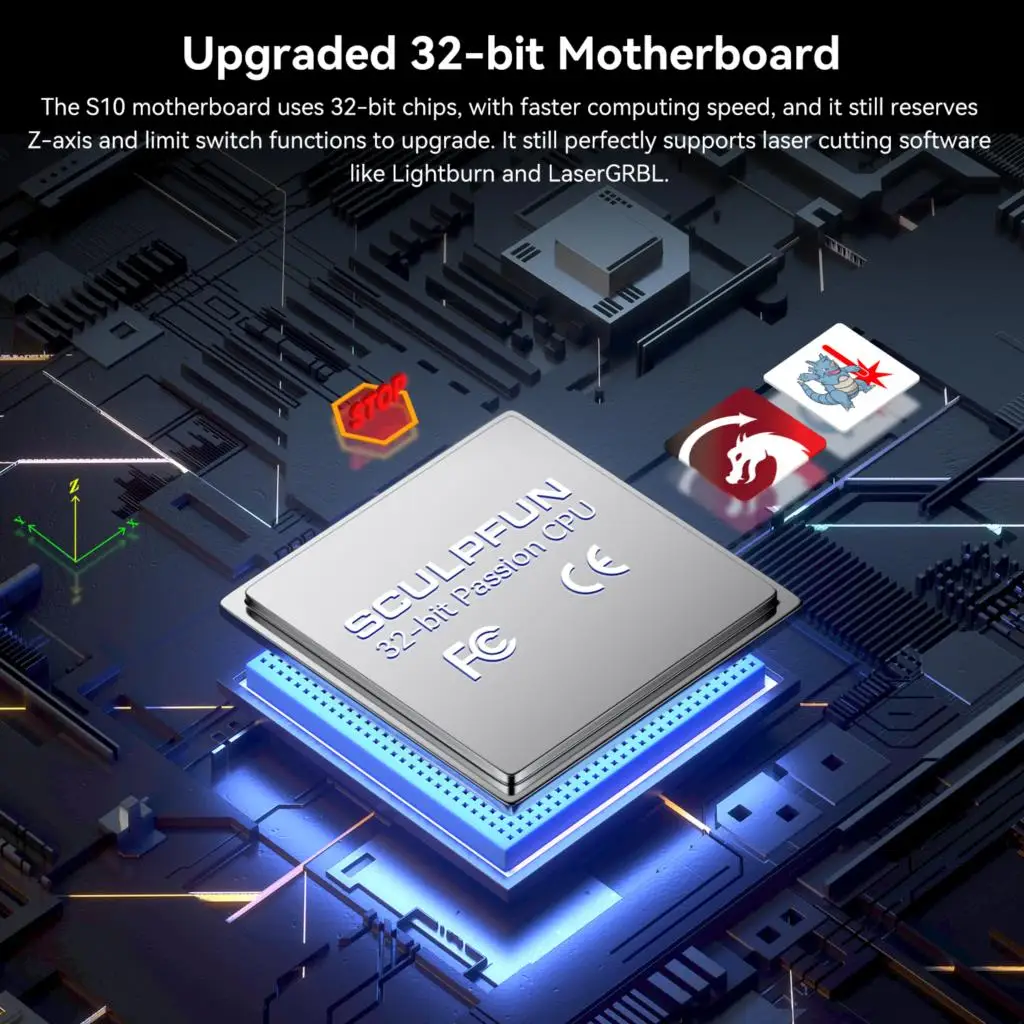 5. Более продвинутые и обновляется 32-битный Материнская плата: S10 материнская плата использует 32-битный чипы с быструю скорость вычислений, И он по-прежнему оставляет за собой функцию Z-axis и концевого переключателя, чтобы облегчить людям обновление гравировального станка. Он по-прежнему идеально поддерживает программное обеспечение для лазерной резки, как Lightburn и LaserGRBL.