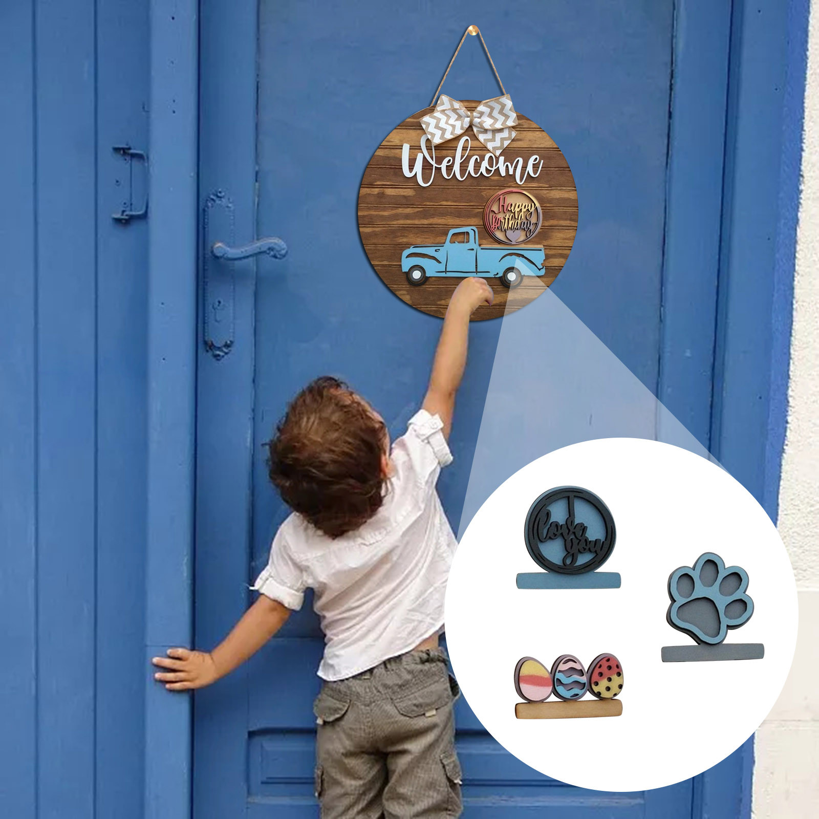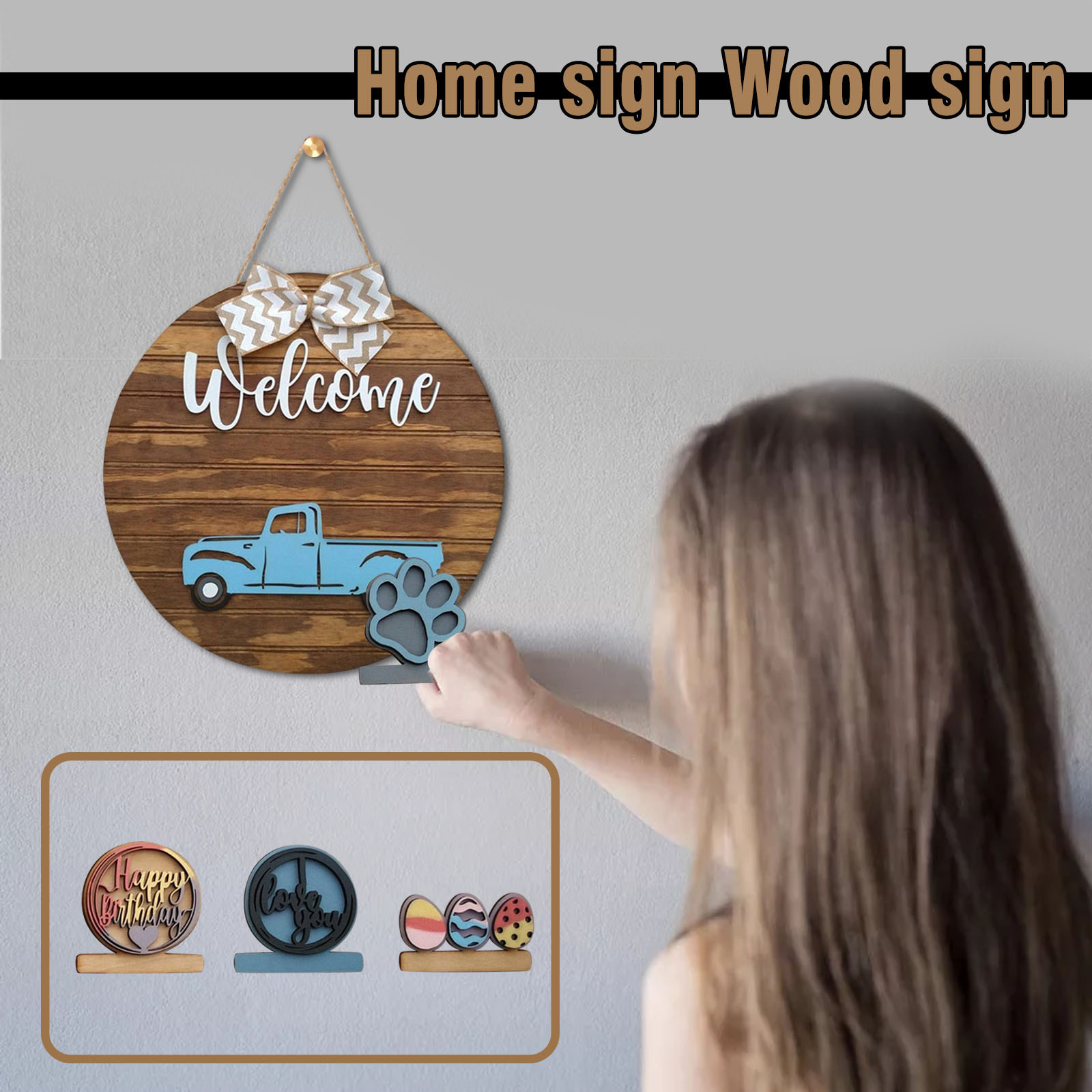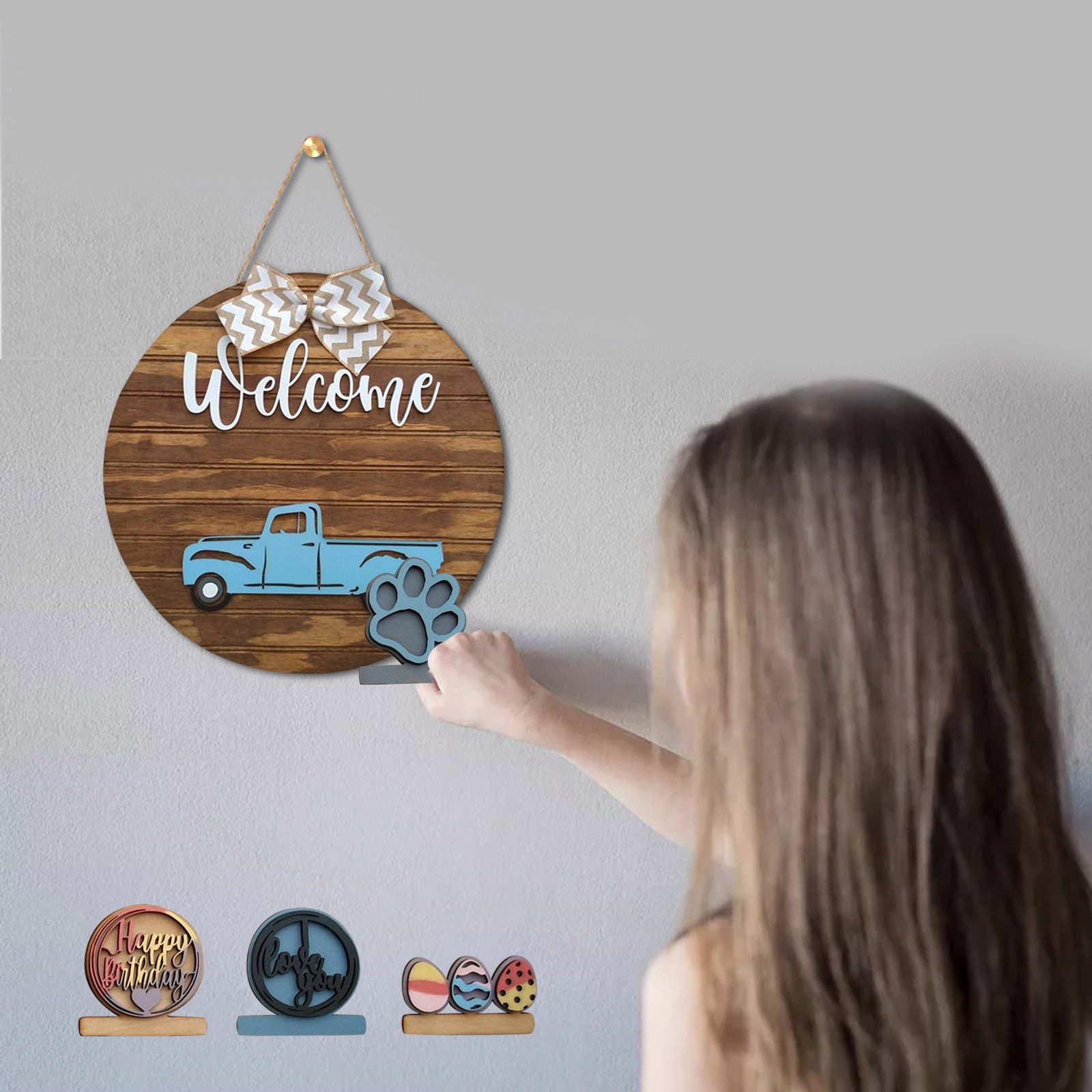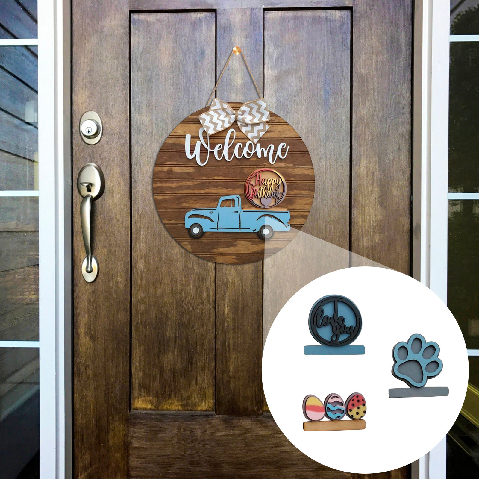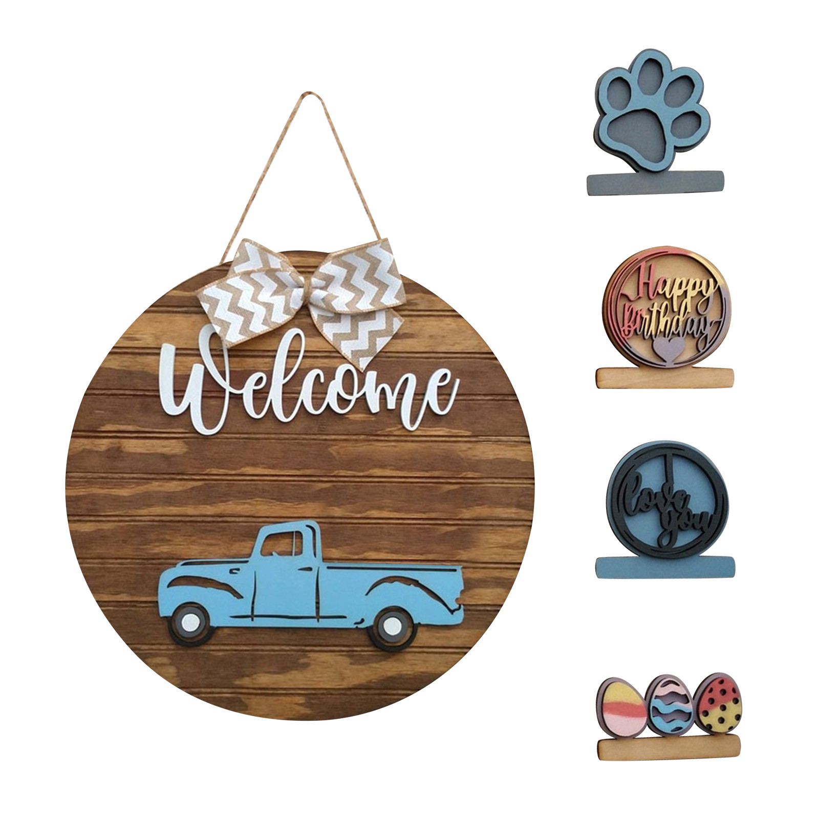 Наш очаровательный взаимозаменяемый знак Добро пожаловать-Это полноразмерный Размер 18 дюймов и поставляется со всеми 4 сезонными подвесками, показанными!