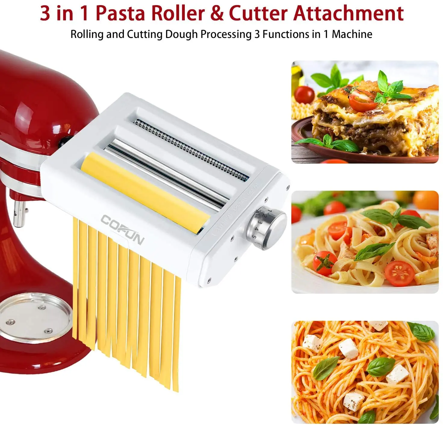 1. 3-в-1 паста набор аксессуаров идеально подходит для всех KitchenAid смесители стойки. Для скручивания теста в тесто требуется только насадка для макаронных изделий, и в то же время нарезать макароны на спагетти и лазанью, не меняя насадку для макаронных изделий. Обеспечьте свою семью и друзей свежими домашними макаронами и лапшей в считанные минуты, легко и удобно ~