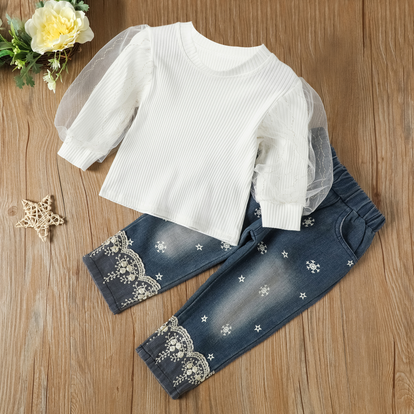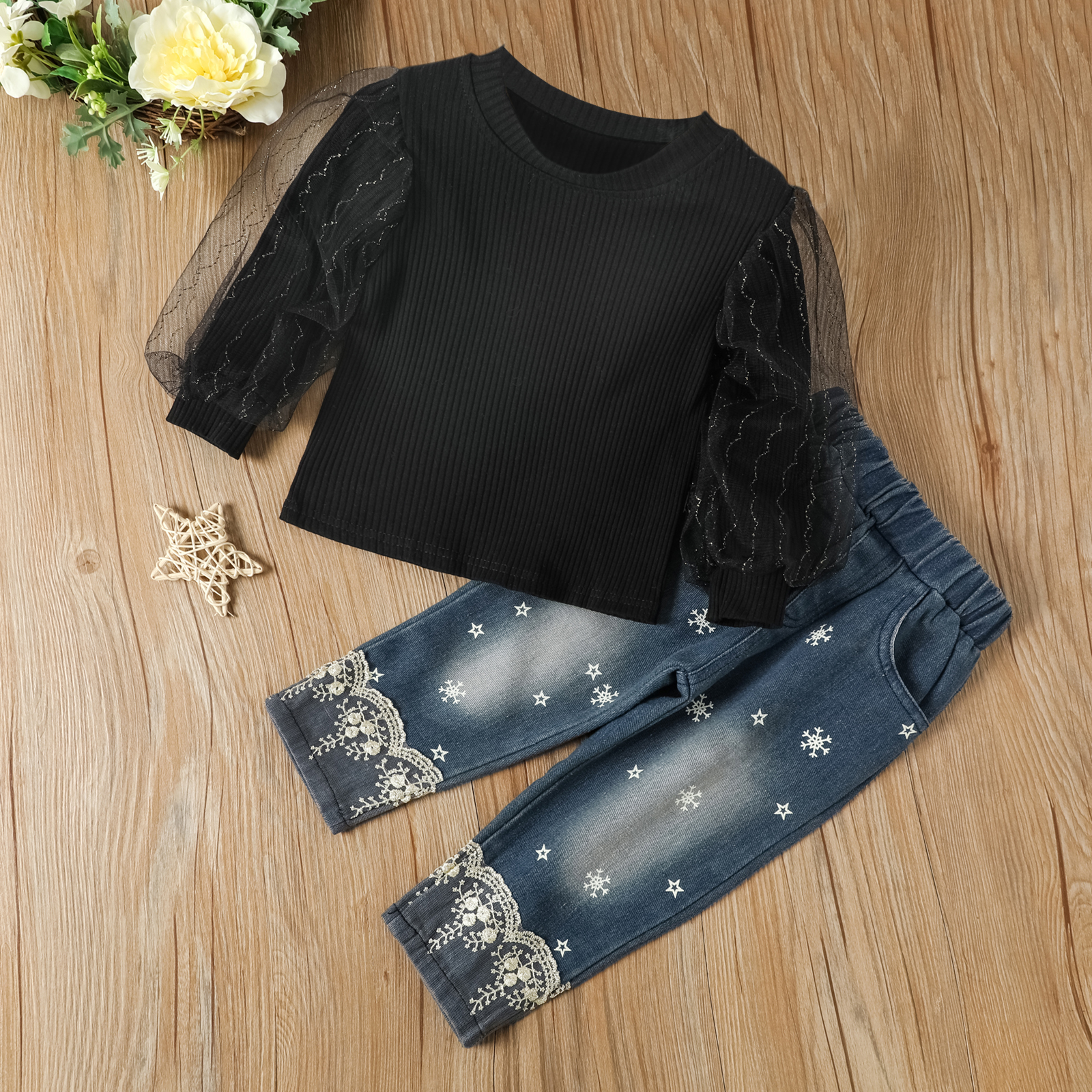 Комплект с брюками для девочек; Сетчатый топ с длинными рукавами и буфами в рубчик с круглым вырезом + джинсы со звездами и снежинками с высокой талией