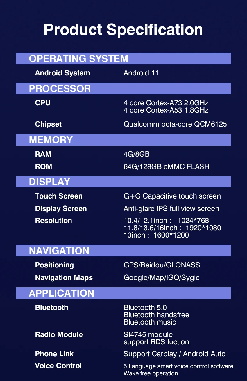 Основные характеристики:1. Разрешение экрана:1920*1080Высокое разрешение, Мульти-сенсорный экран, поддержка HD 1080P /4K ISP экран2.БТСинхронизация телефонных звонков ручной работы список контактов3.Поддержка Wi-Fi,3G,4G интернет, Может поддерживать связь через WhatsApp Twitter, Facebook, Gtalk, Gmail ,wave и другие сервисы Google.4. Поддержка тысяч Загрузок Программного обеспечения с Android Market5. ВстроенныйGPSНавигация, GPS + Glonass двойная спутниковая система положения и поддержка онлайн-карты, поддержка Google Map, Sygic Waze и других GPS программ6.Камера заднего вида: Встроенный видеовход камеры для подключения камеры заднего вида после выхода на рынок для безопасной парковки.7. Радио чип NXP6686, AM / FM с RDS8. ПоддержкаУправление рулевым колесом9.OSD язык: английский/русский/французский/немецкий/испанский/итальянский/арабский/Португальский/Турецкий/тайский/Польский/иврит Все 53 языкаИнформация о системе:1. Операционная система:Android 11,02. ЦП:Устройство, док-станция Qualcomm 8 ядро3.RAM + ROM:4 + 64 ГБ/8 + 128 ГБ4. Сенсорный экран:Емкостный сенсорный экран 12,1 дюймов,14,4 Дюймов5. Встроенный:Carplay