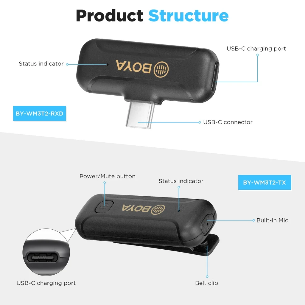 🎙BY-WM3T2-U1 совместим с большинством устройств Android с USB-C-портами, включая смартфоны и планшеты. Он имеет 1 передатчик и 1 приемник.