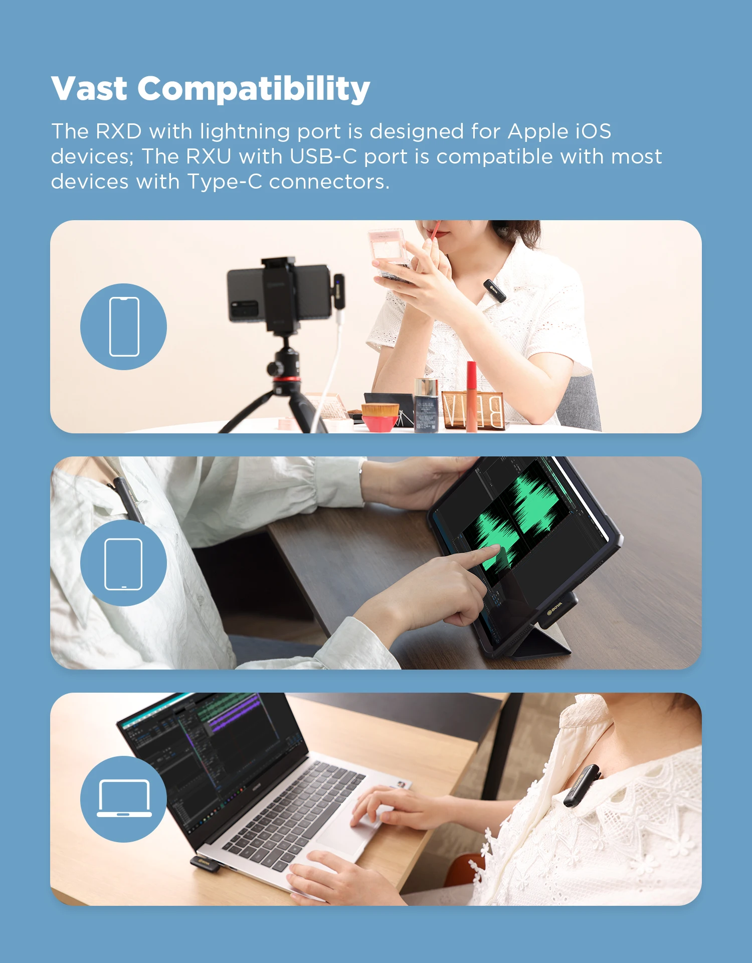 🎙BY-WM3T2-U2 совместим с большинством устройств с USB-C-портом, включая смартфоны и планшеты Android. Включая 2 передатчика, BY-WM3T2-U2 может одновременно записывать два источника звука.