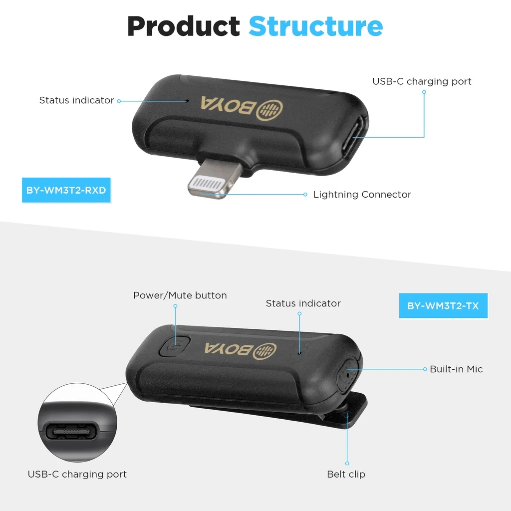 🎙BY-WM3D2-D2 с сертификацией MFi Lightning, BY-WM3T2-D2 предназначена для устройств Apple iOS. Включая 2 передатчика, он может одновременно записывать два источника звука.