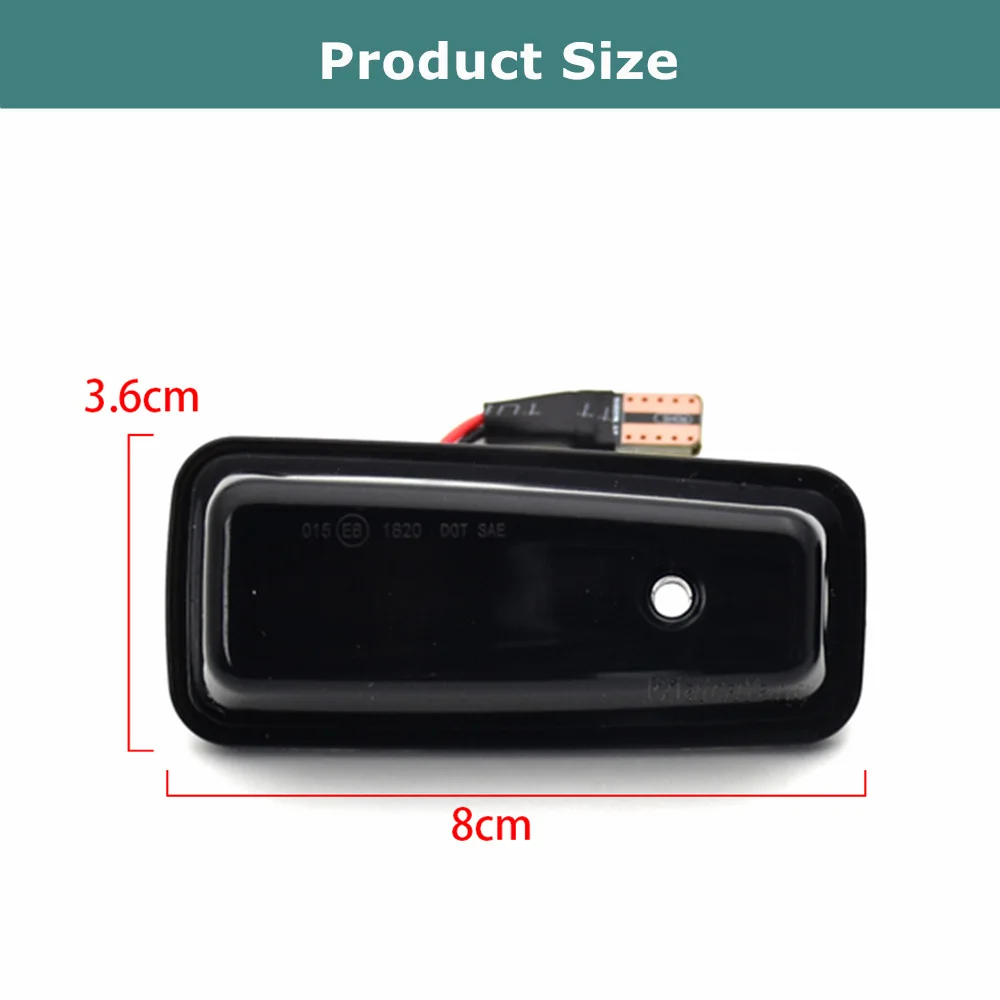 Type: LED Side Fender Dynamic Turn Signal Light Material: High Quality PC Shell + LED light Voltage: 12V LED light Color: Yellow/Amber Housing Color: Smoked Black/Clear Certificate: IP67 E-mark, CE, DOT, SAE Placement on vehicle: left, right, front Listing Includes: 2 × LED side marker light ( Left and Right) Benefits: Dynamic turn signal,scroll smoothly.Easier to be seen by other drivers when you are turning right/left. New Beautiful design .Give your Car a unique premium Euro style with excellent LED lighting and increased safety.