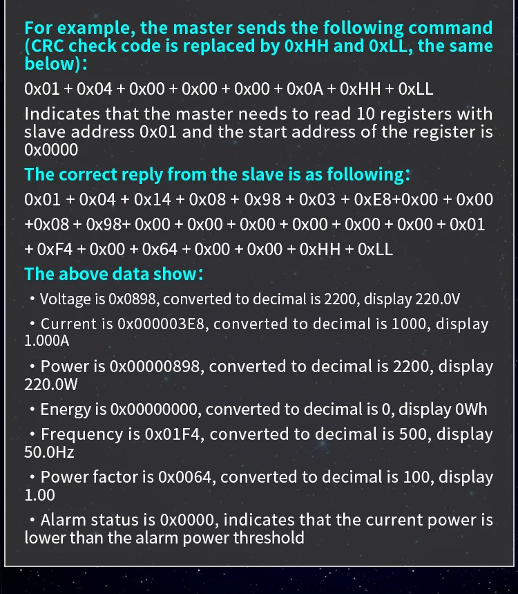 Рабочий адрес + 0x04 + зарегистрированный адрес высокий байт + зарегистрированный адрес низкий байт + количество регистров высокий байт + количество регистров низкий байт + проверка CRC высокий байт + проверка CRC низкий байт.