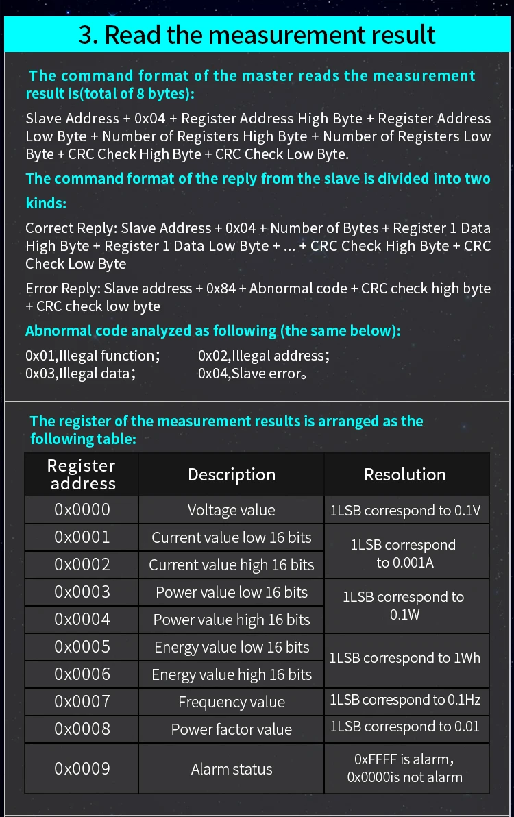 Командный формат мастераЧтобы прочитатьПараметры и чтение результатов измеренийОдинаковые(Подробное описаниеSВ разделе2. 3), нужно только изменить код функции от 0x04 до 0x03.