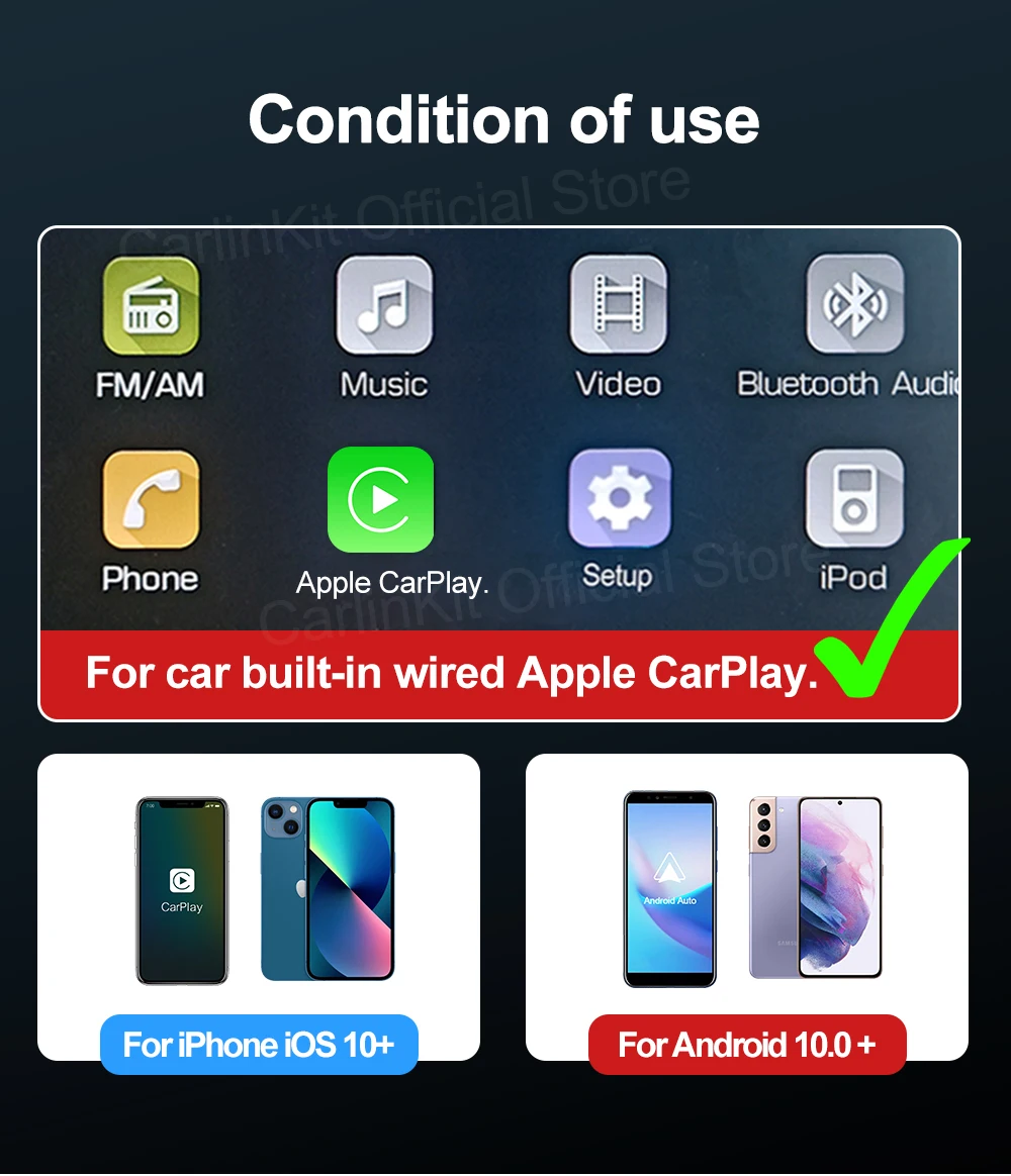 Перед заказом, пожалуйста, проверьте, есть ли у вашего автомобиля Этот проводной значок Apple CarPlay на экране автомобиля. Если да, этот продукт может работать для вашего автомобиля.