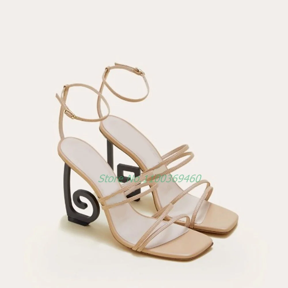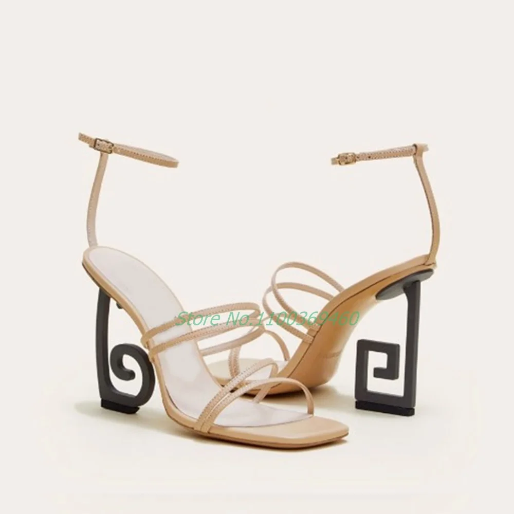 Product Name:Strange Heel Concise Solid Sandals Square Toe Narrow Band Ankle Buckle Novel Asymmetrical Notes Catwalk Modern Summer Newest